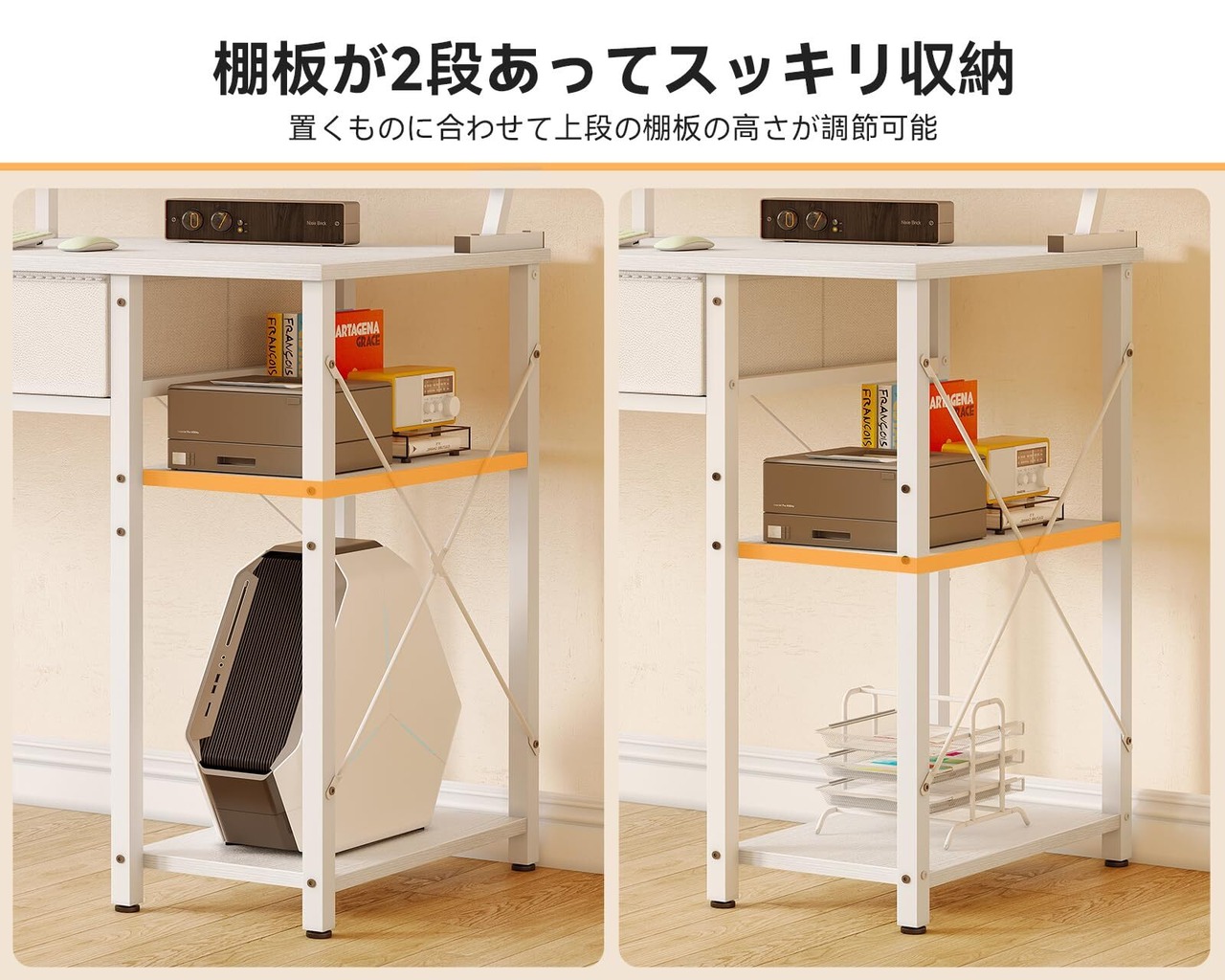 【収納力満載のラック、手の届く便利さ】ラックには棚板が2段あり、置くものに合わせて上段の棚板の位置が調節可能です。下段の棚板はCPUシェルフで、PCケースなど大きなものは収納できる。お好みに合わせて、ラックの部分は左右どちらにも設置OK。限られたスペースで効率的な収納を実現しています。