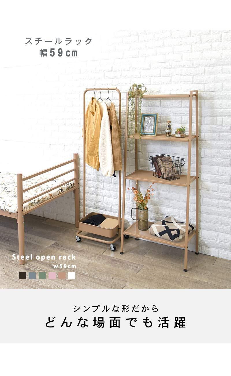 落ち着きのあるくすみカラー採用した、スチールオープンラック。美容品の収納棚から観葉植物のディスプレイまでこなします。