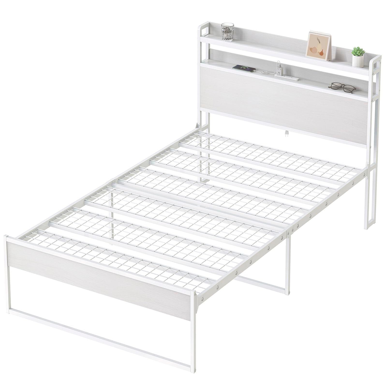 SINNONAKA USB&2口コンセント ベッドフレーム 2段宮棚付き パイプベッド 高耐荷重 収納付き スチールベッド シングルベッド カビ防止 アイアン 脚付き フレームのみ 頑丈 木製 (ホワイトウォッシュ×ホワイト)