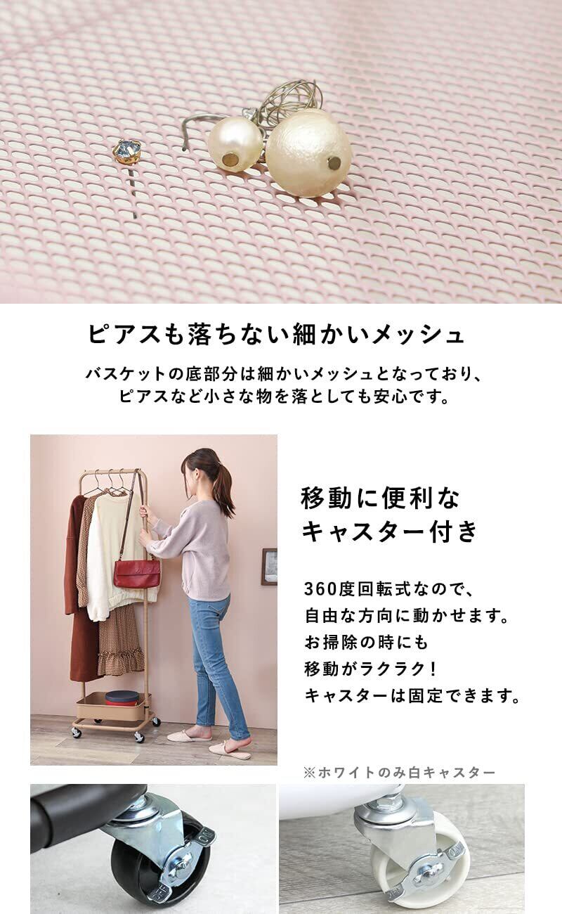 高さが変えられるバスケット付きハンガーラック。落ち着きのあるくすみカラーを採用。