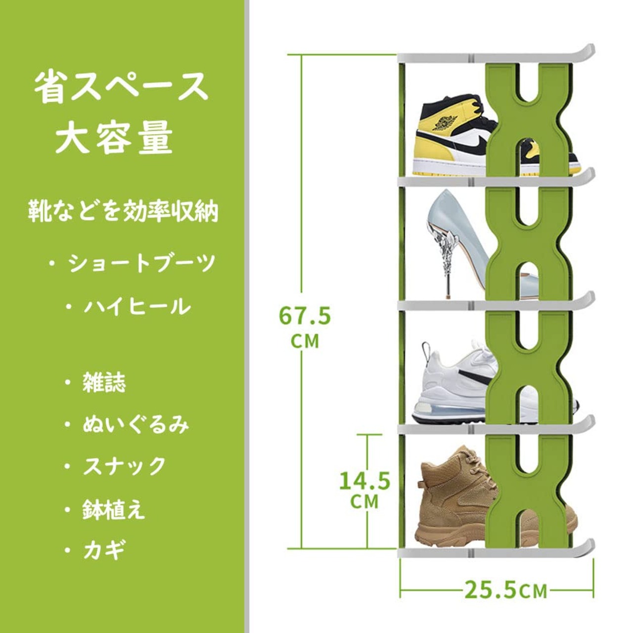 サイズ:27x25x段数の高さ ほとんどipadと同じ大きさです。このサイズなシューズラックは専門に狭い場所「一人暮らしに狭い玄関など」に対応したの設計です。5段のラックには大人靴5足で、各段に1足靴置きことができ、靴収納の需要を満たすと同時によりスペースを節約できます。
