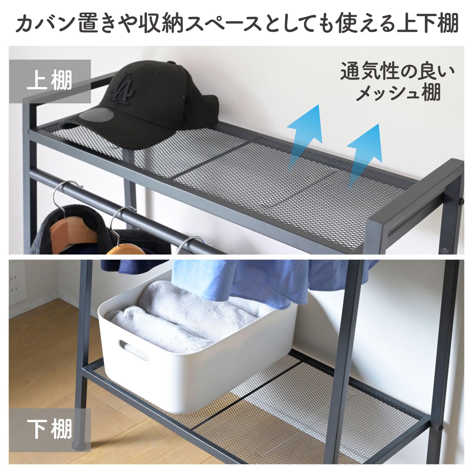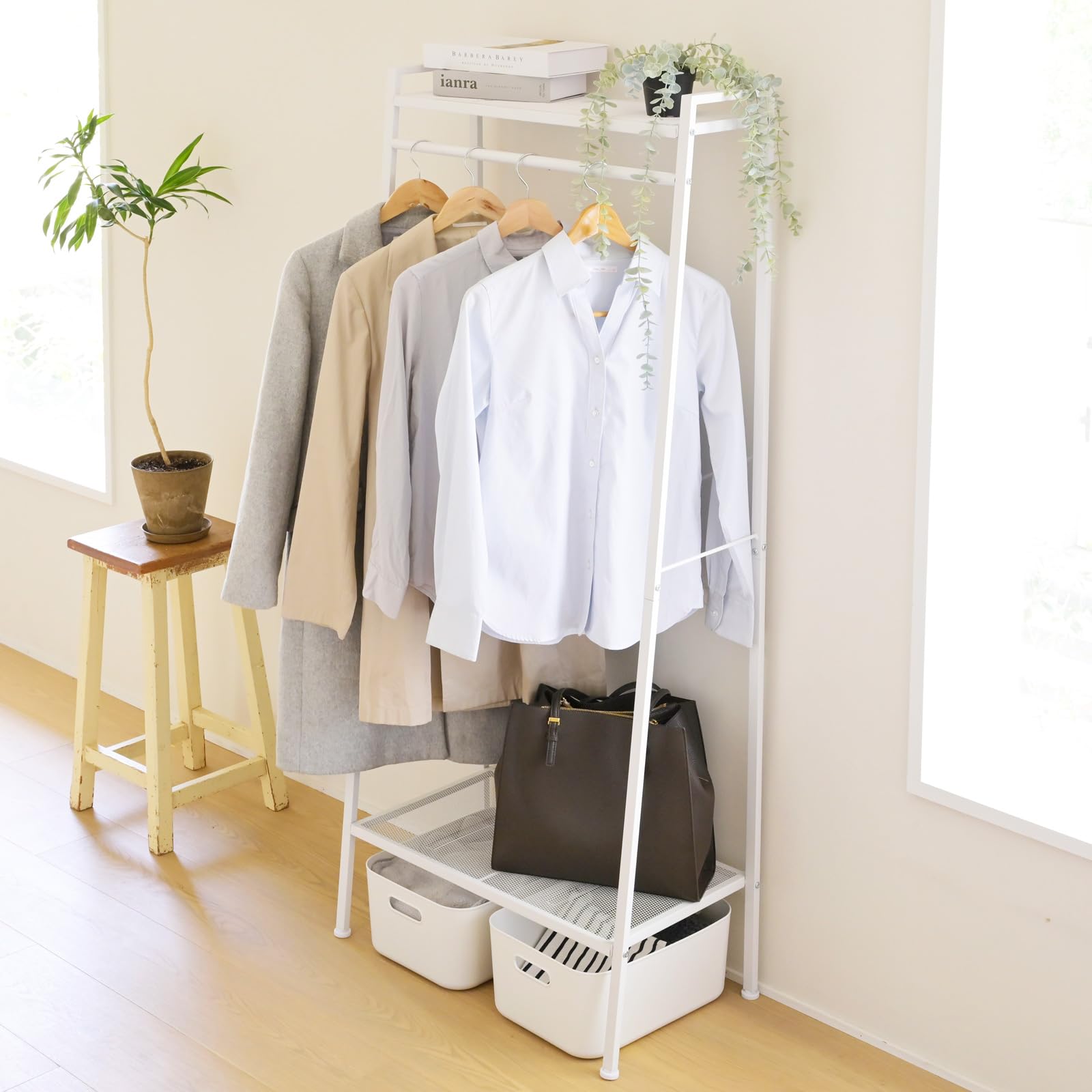 【棚付きハンガーラック】棚付きなので衣類と一緒にバッグや帽子も収納できるハンガーラックです。身支度に必要なものを一式まとめて収納しておけます。