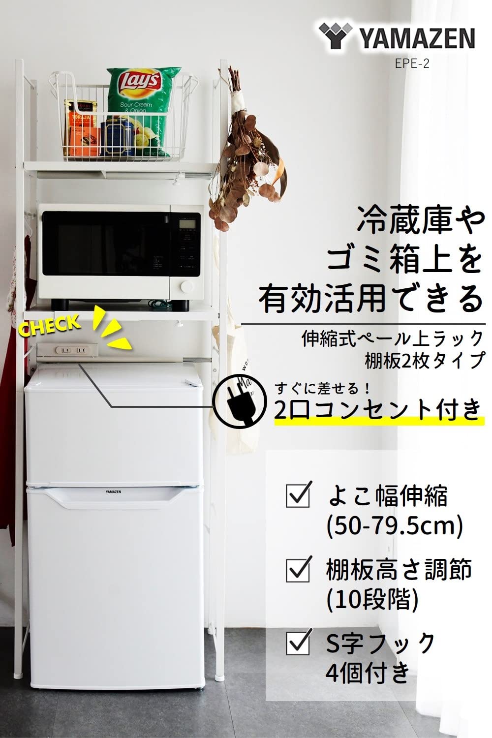 【在庫セール】山善(YAMAZEN) レンジラック ゴミ箱上ラック (2口コンセント付き) 【全体耐荷重60kg】 幅50-79.5×奥行42×高さ170cm 高さ調節可能 棚板2枚 フック4個付き レンジ台 スチール 組立品 ホワイト EPE-2(WH)