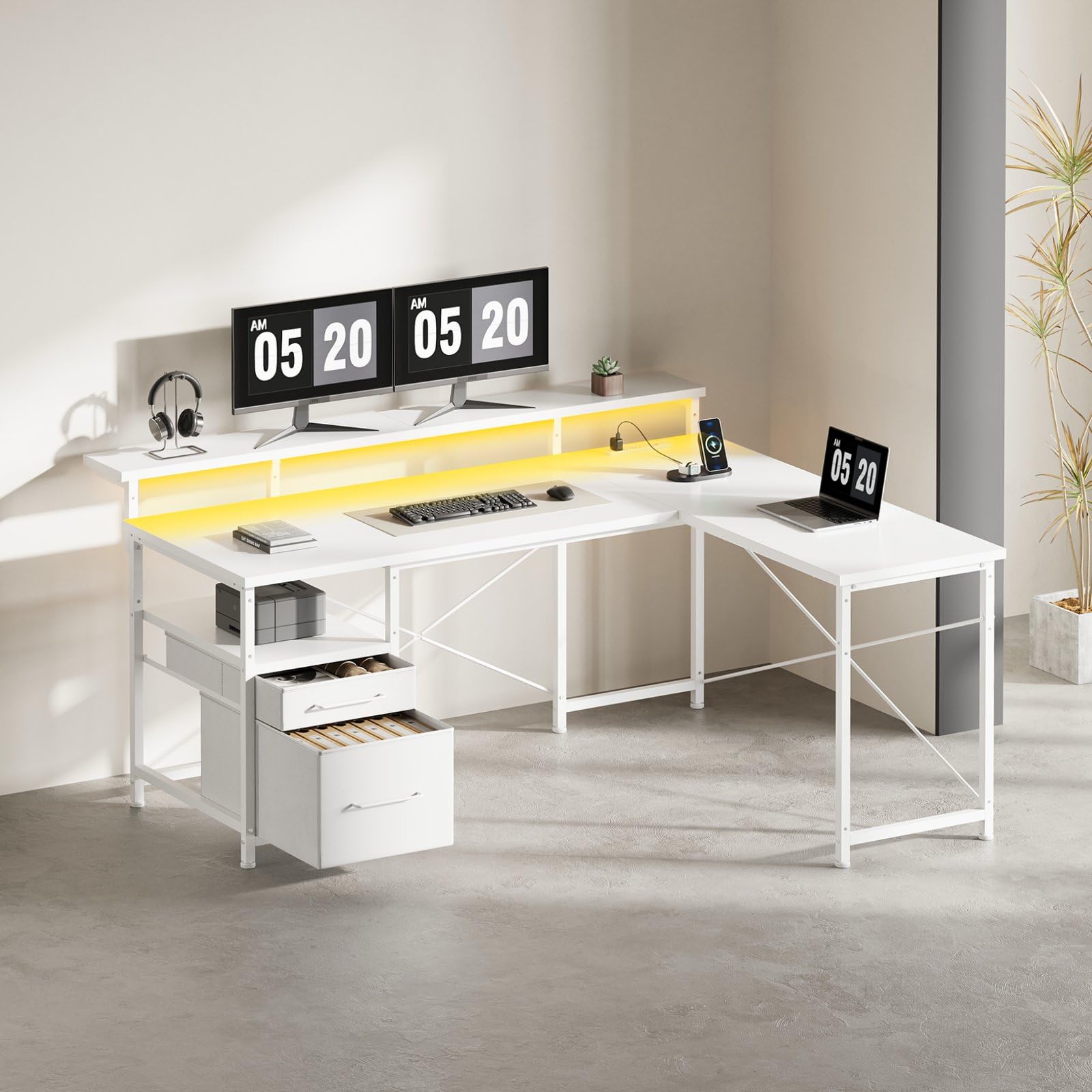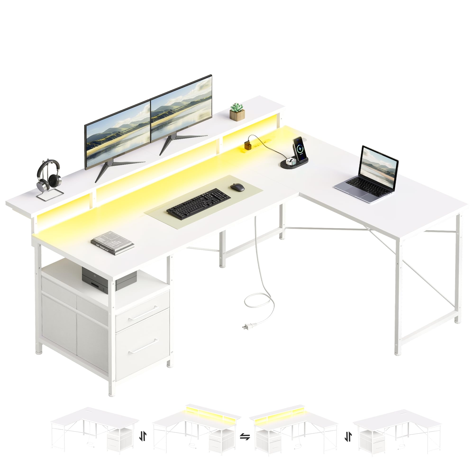 【2022最新】Maihail l字デスク LEDライト付き ゲーミングデスク パソコンデスク 幅155*110cm コーナーデスク デスクトップラック調節可能 L字型 白い