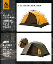 【優れた通気性】2つの出入口があり、前室には靴や荷物などを置くことができます。入口の上部には通気口があり、サイドから開口しているため、雨風が内部に入り込むことを避けます。 テントの防水性、防風性、耐久性は非常に優れており、耐水圧は3000以上です。大雨の中でも雨漏りの心配はありません。