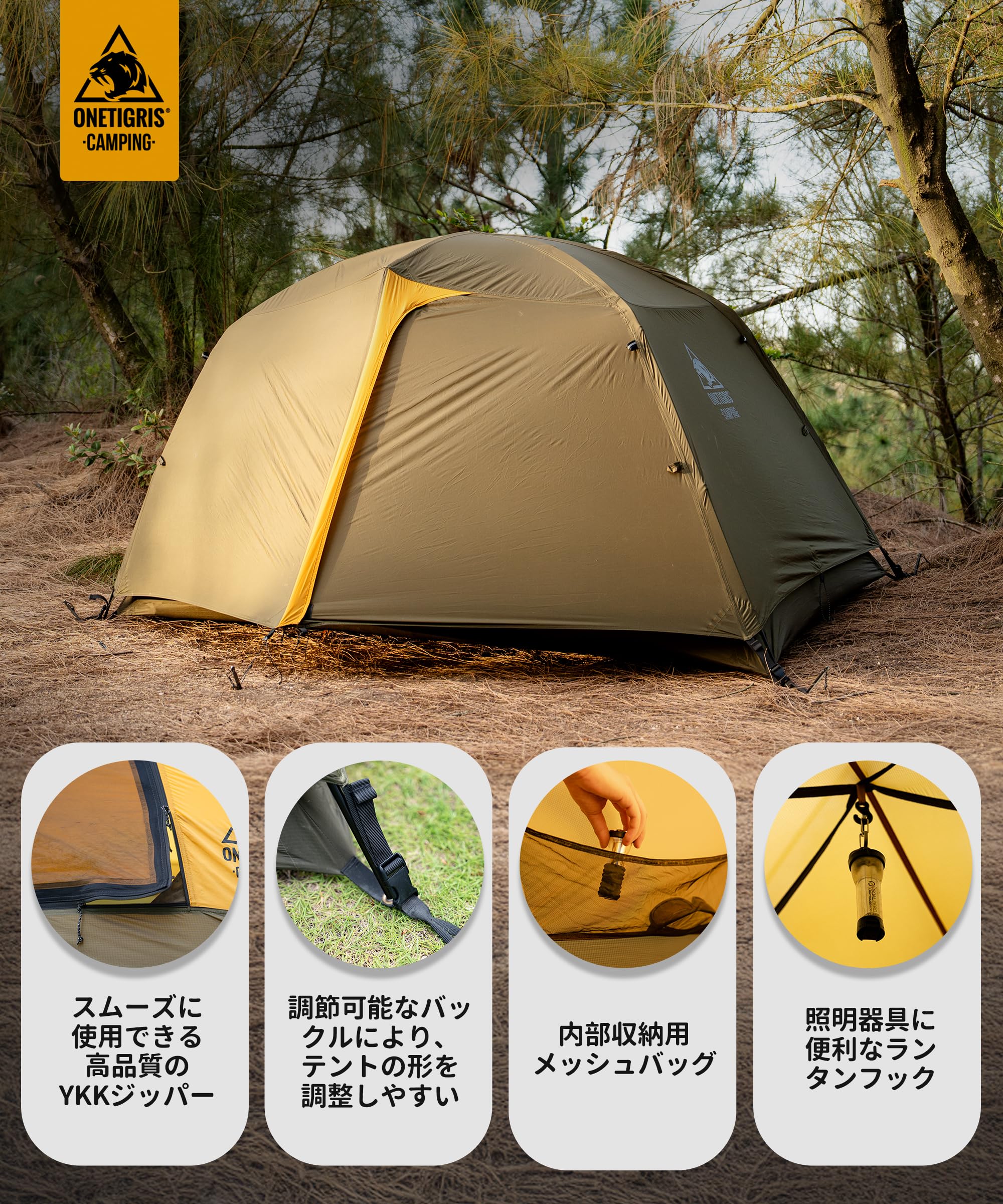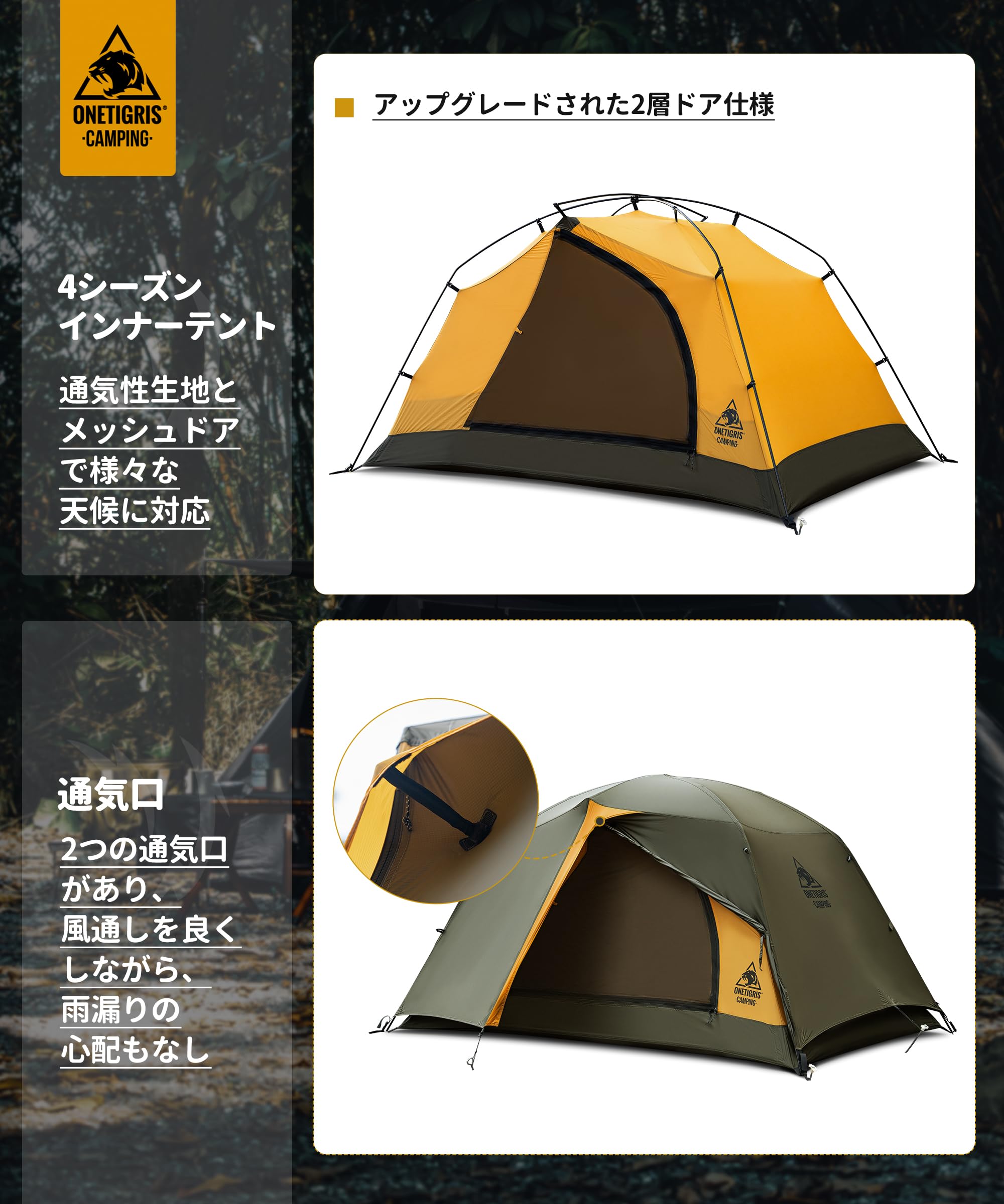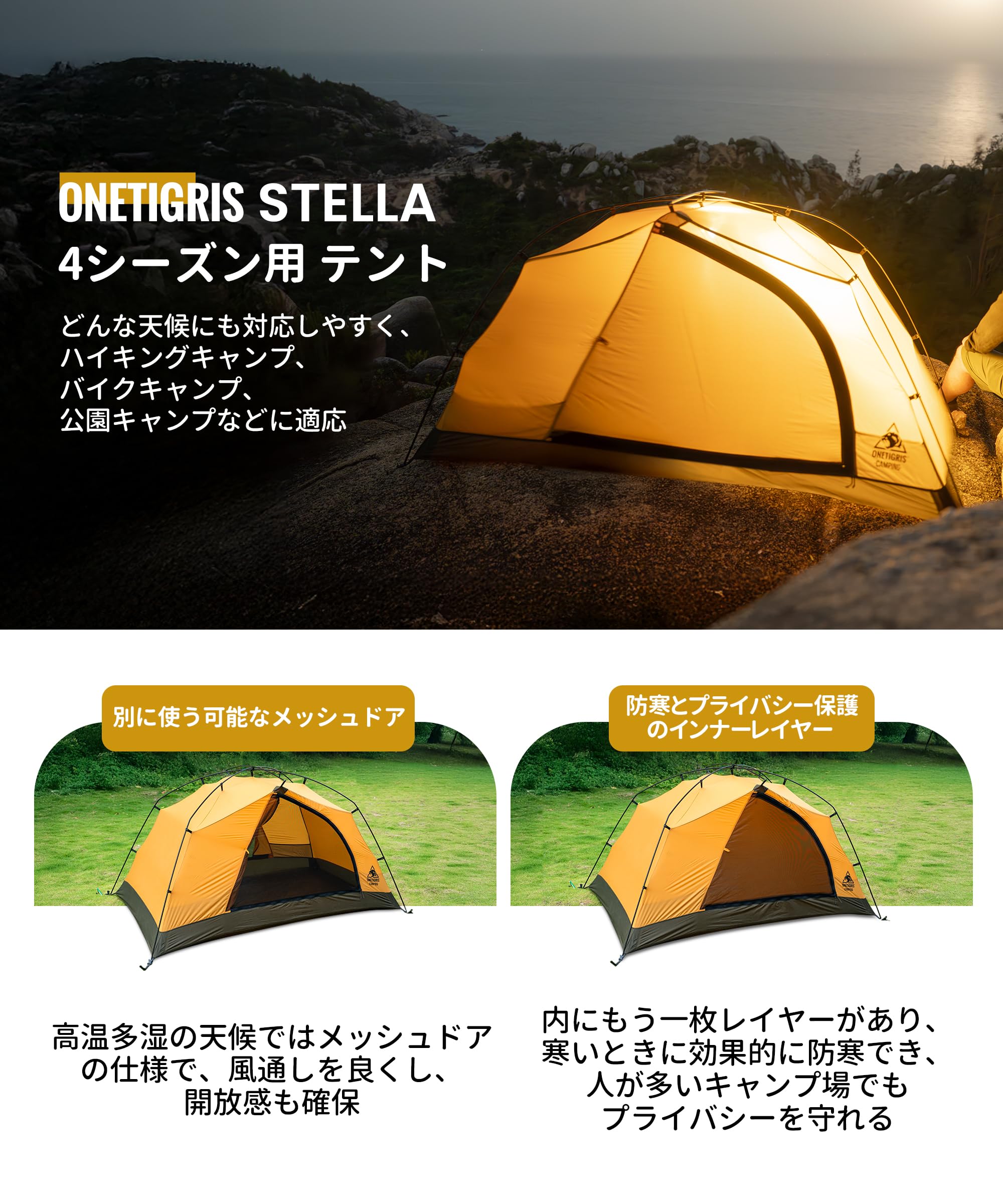 OneTigris STELLAテント 2人用 ドームテント 4シーズン 二重層 前室付き 耐水圧3000㎜ 自立式 山岳 キャンプ 用品 登山 キャンピング 収納袋付き