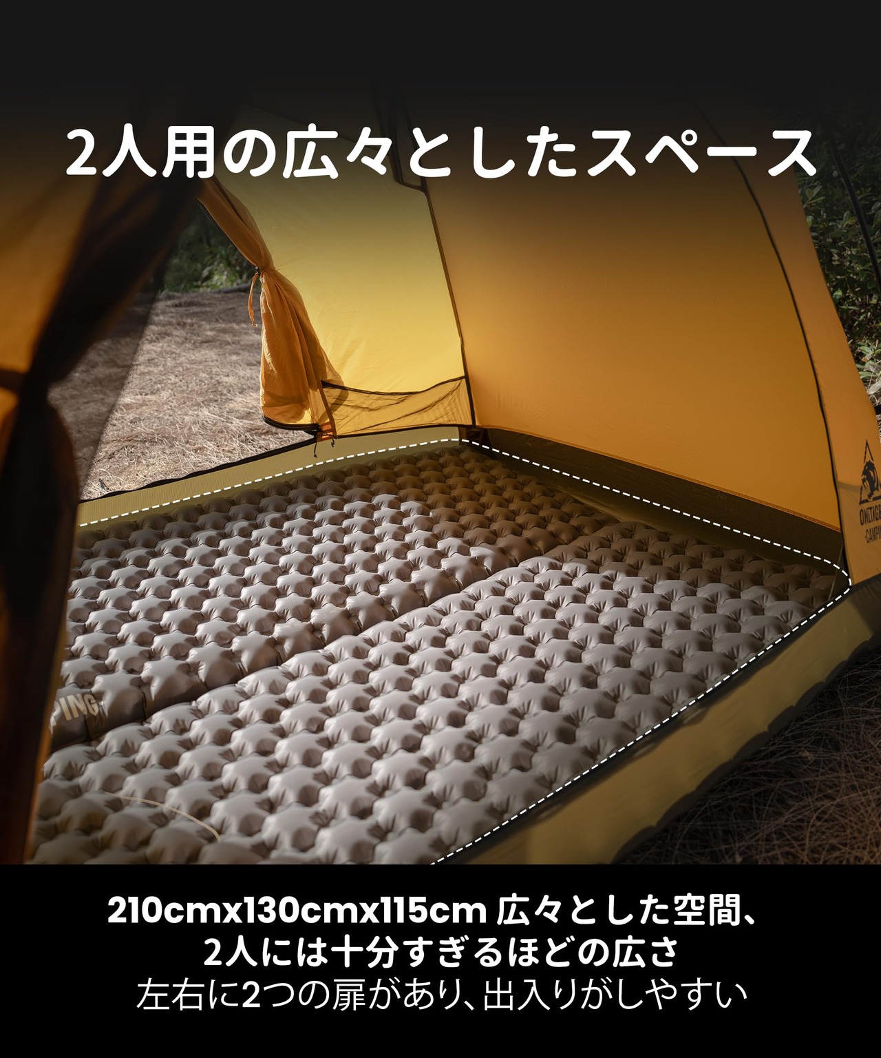 【見た目以上に広々とした室内スペース】インナーテントの使用面積は130cm×210cm、頂部高さ115cmで、天井のクロスポールが豊富な頂部スペースを提供します。テント壁面の角度を大きく取り、内部空間が広くなっていて、ゆとり空間を楽しめます。 また、インナーテントの下部には小物を収納できるポケットがあり、携帯電話や財布、鍵などの小物を収納することができます。