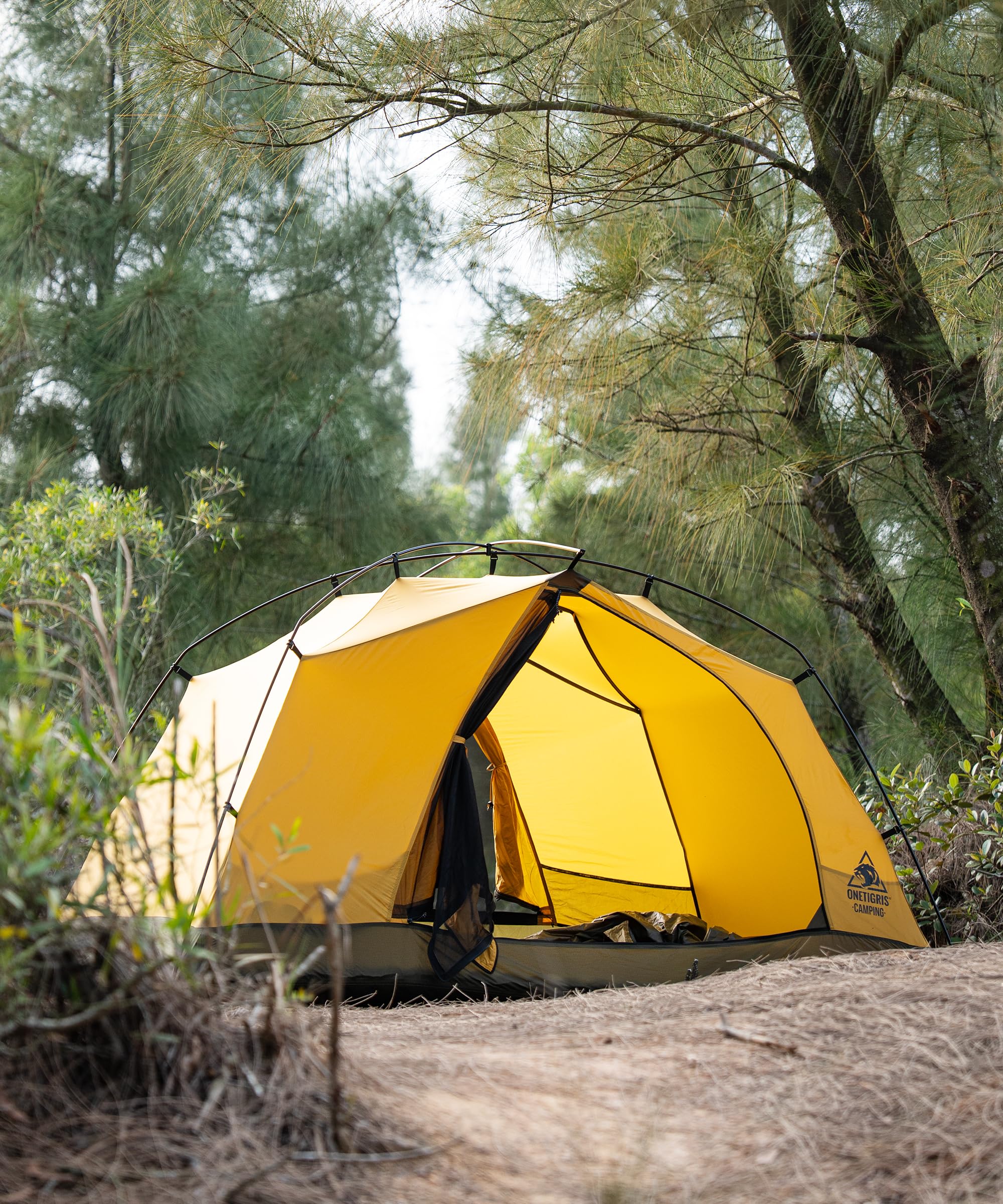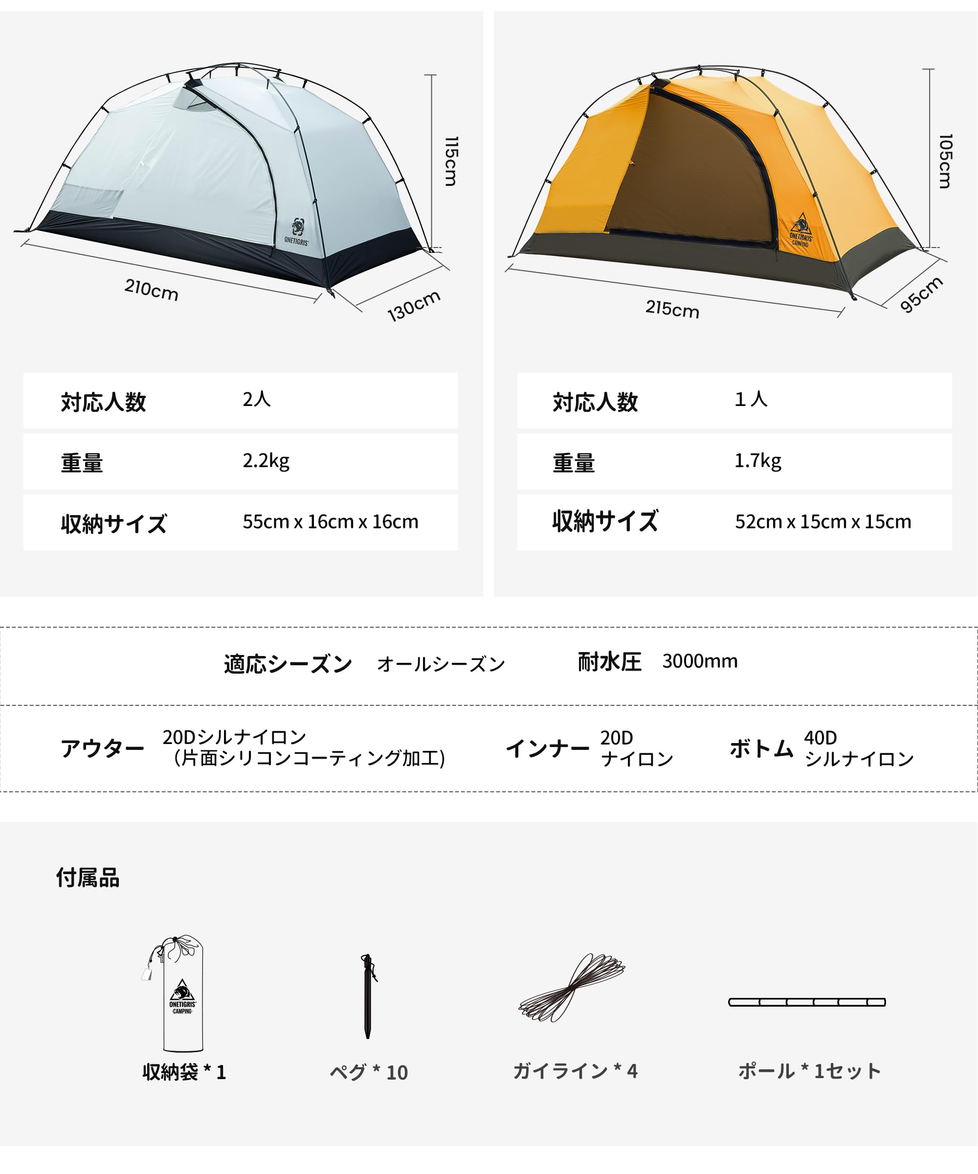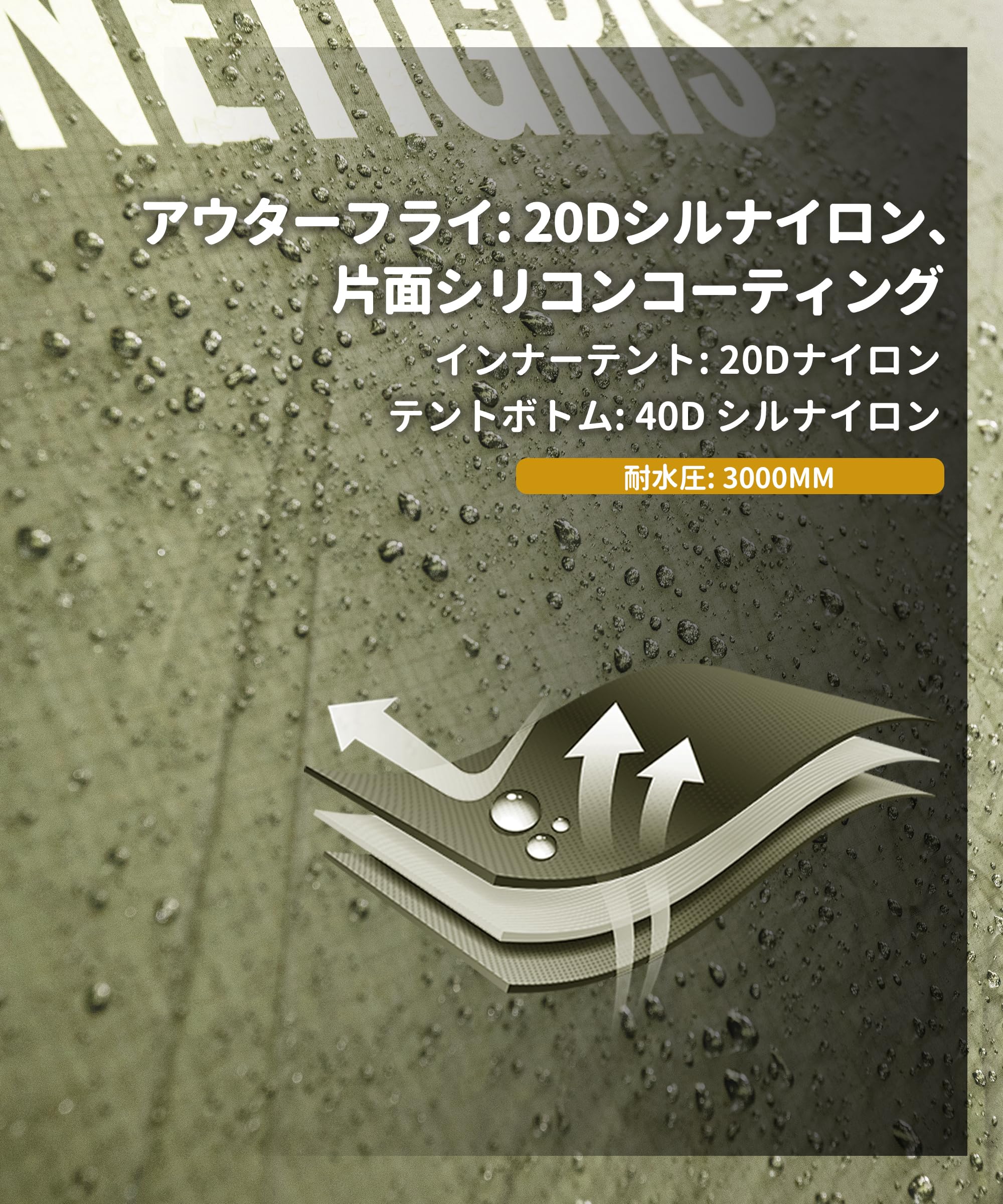 【高品質素材】当社のテントは、軽量で高い防水性能を実現するために、20Dナイロンシリコンシングルコート生地を使用して、生地は軽く柔軟で耐久性に優れています。 また、底布には厚手の40Dポリエステル生地を使用しており、高い防水性能を実現しています。ファスナーには日本の有名ブランドYKKを採用しており、耐久性に優れています。テントポールには7001アルミニウムポールが採用されて錆びにくくなっています。