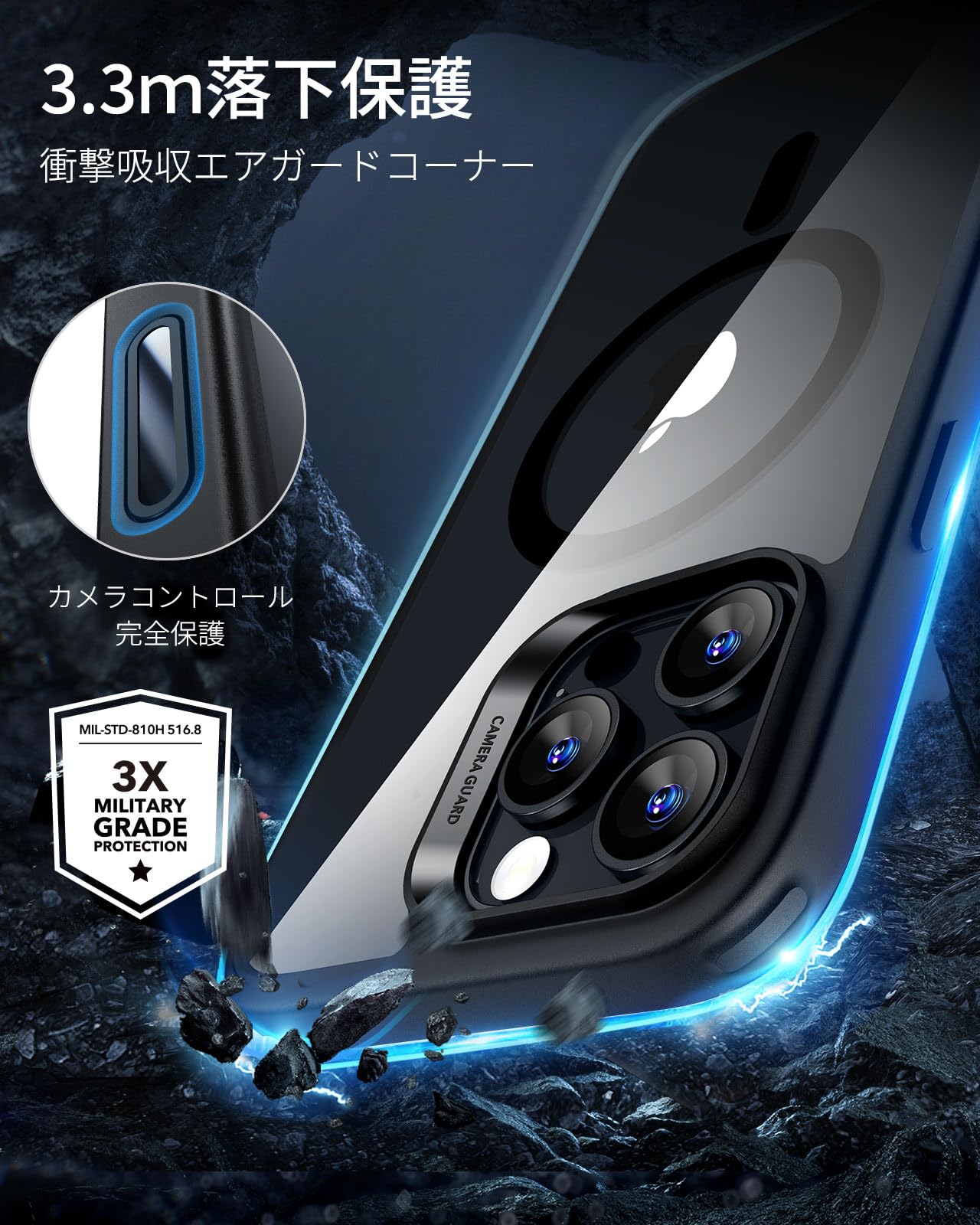 【軍事レベル基準!衝撃から守る全方位ガード】 米軍規格MIL-STD-810Hの落下試験に合格したエアガードコーナー(認証番号:GZMR231203686802)を採用します。iphone16promax ケース はコンクリートへの高さ3.3メートル落下テストにも耐える設計で、駅のホームでの使用や登山中など、アクティブなシーンでも安心できます。うっかり落とした時も、大切なiPhoneを確実にプロテクトします