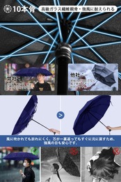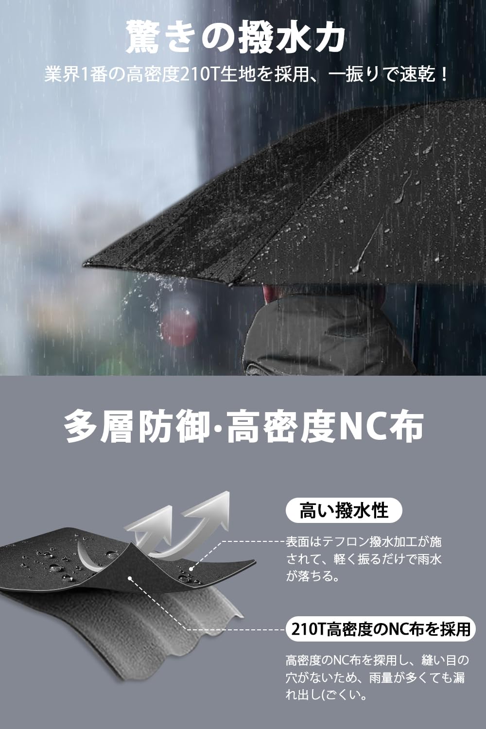 【強風や豪雨に負けない耐久性&高強度な10本骨 】 10本の折りたたみ傘骨に軍需級炭素繊維用アルミ合金とグラスファイバ一を使用しました。強い風にも折れにくい、優れた耐久性が特徴です。改良グラスファイバー製の10骨が風速14m/sに耐えられる。内側に風を受けてしまい逆さになってしまっても、いつものように折りたたみ傘を閉じる動作で簡単に元戻ります。傘布は高密度のポリエステル素材採用、表面テフロン撥水コーティング施され、豪雨の中でも体が濡れることはありません。携帯便利だから、鞄に常備する事で、とっさのゲリラ豪雨にも対応できます。ハンドル:高質感ABS樹脂