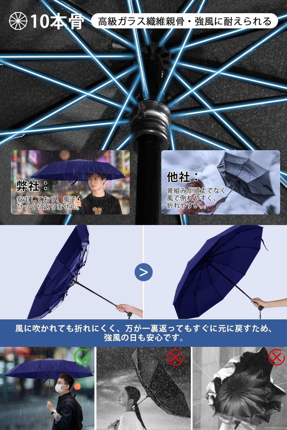 【大きいサイズ&頑丈の折りたたみ傘 軽量 メンズ】折り畳み傘の表面のアークの長さが114cmに達し、傘の直径が100cmに達しております。普通の折り畳み傘 メンズの直径が90cmしかありません。大雨·強風の日も安心の大きめサイズ!大人二人がすっぽり入ります。しかもシンプルなデザインを採用し、ビジネスカジュアルにも便利に合わせることができます。更に落ち着いた色もメンズに適します。また、頑丈な10本骨 折りたたみ傘です。 柔軟性と強度を併せ、耐風性と耐久性ともに向上させた折りたたみ傘です。 空気力学に基づいて風を受け流す構造で設計されているので、強い風でびっくり返っても元に戻ります。 また、コーティングを噴霧しているので錆びることは心配がありません。