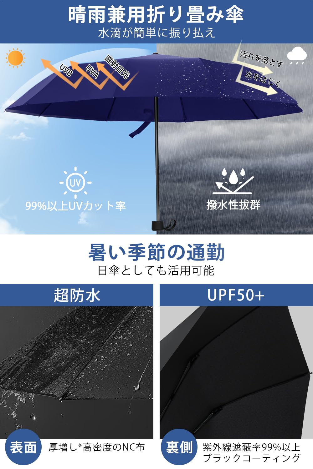 【超撥水性・晴雨兼用折畳傘 軽量】230T超高密度のテフロンポリエステル材料で作られ、普通の折畳傘 軽量 大きい より撥水性に優れた。豪雨の中に軽量 折りたたみ傘の下に入れば、あなたの体のどこも濡れません。折り畳み傘に超撥水のテフロン加工を施すので傘を閉じた後、軽く振るだけで、水滴が簡単に振り払えます、電車内等の公共の場で、人に迷惑をかけません。さらに、内側には遮光遮熱コーティングを施され、日差しの強い日は光を通さずUVカットしてくれるので、雨の日だけでなく、暑い季節の通勤に日傘としても活用可能。傘布は皺が生じにくく、いつでもファッションな外観を保持します。