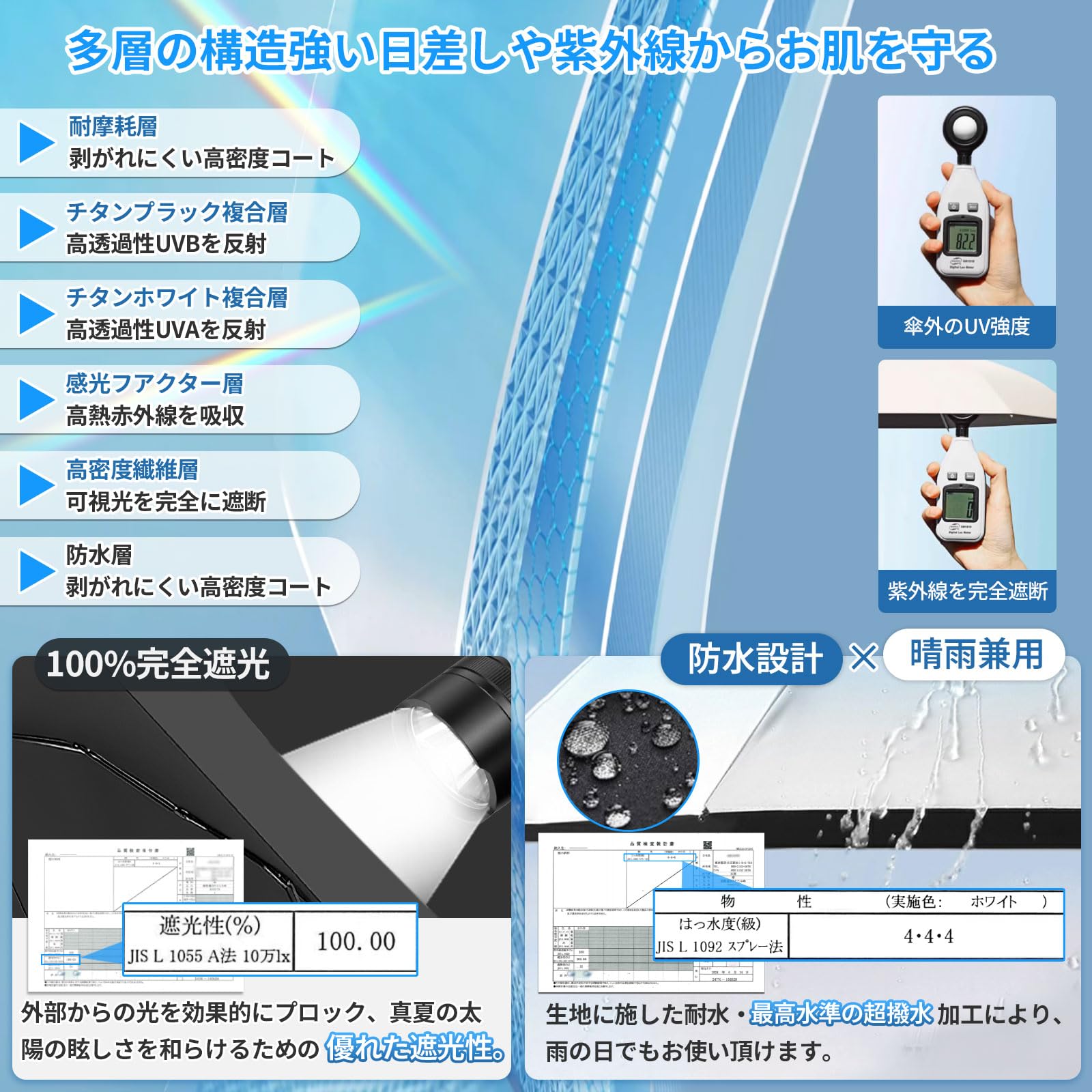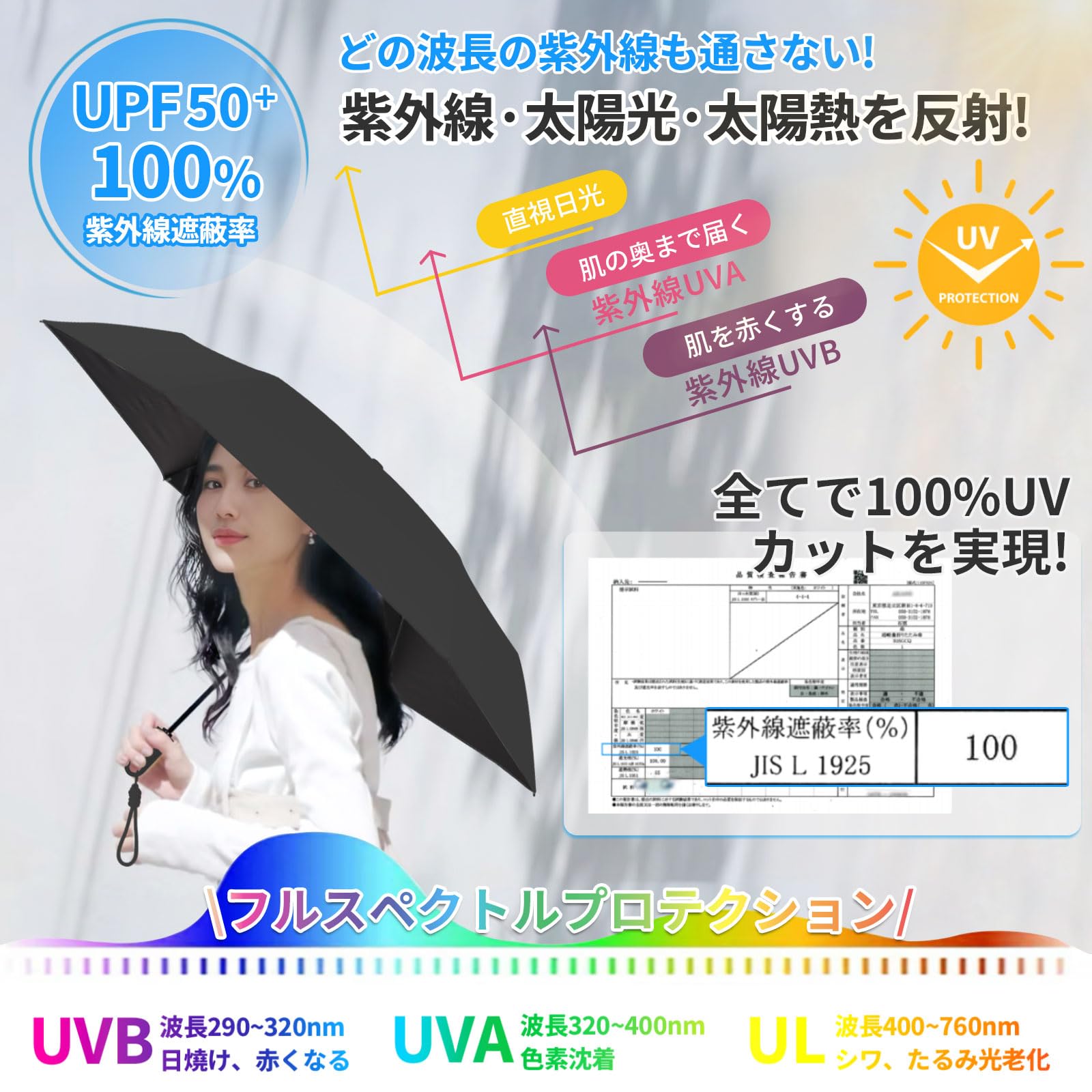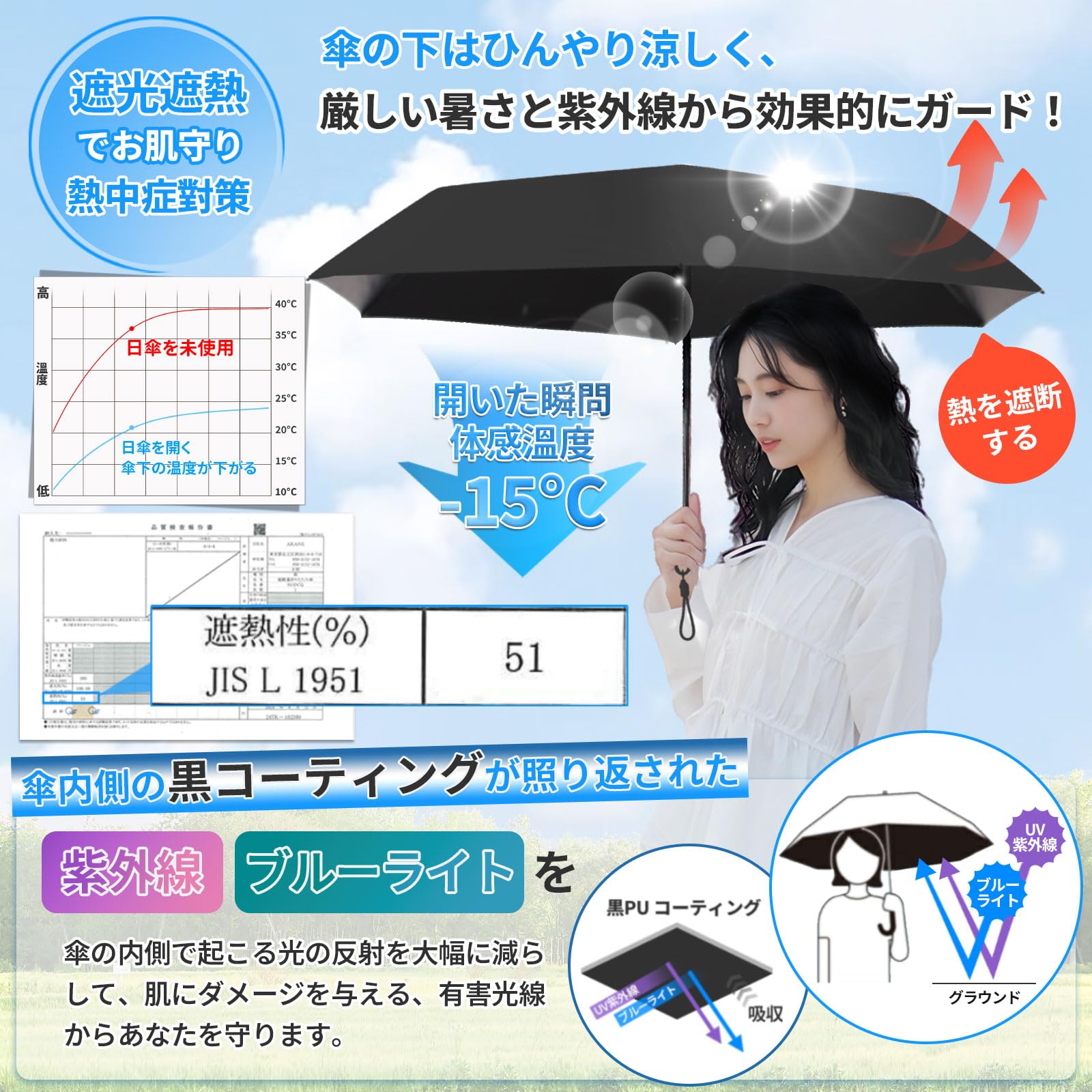【遮光率・UVカット率100%、UPF50+】この超軽量日傘は、高密度生地に多層の黒ノリコーティングを施しており、UPF50+、UVカット率100%、100%遮光を実現します。効果的に日焼けを防ぎ、肌を日差しや有害な紫外線からしっかりと守ります。日焼け防止や熱中症対策にも役立つため、折りたたみ日傘として常備しておけば、猛暑の日でも安心して外出できます。