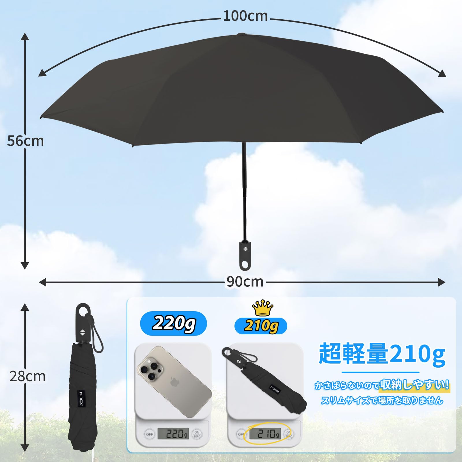 【超軽量&持ち運び便利】 コンパクトな大きさなのでバッグに隙間にも邪魔にならず入れることができます。折りたたんだ際の厚さはわずか4cm、長さは28cm、重さは約210gと 超軽量 折り畳み傘 です。他の日傘と比較して、収納スペースを約40%節約できる設計となっております。バッグや車に常備すれば、通勤や通学、旅行先でも手軽に紫外線対策ができ。
