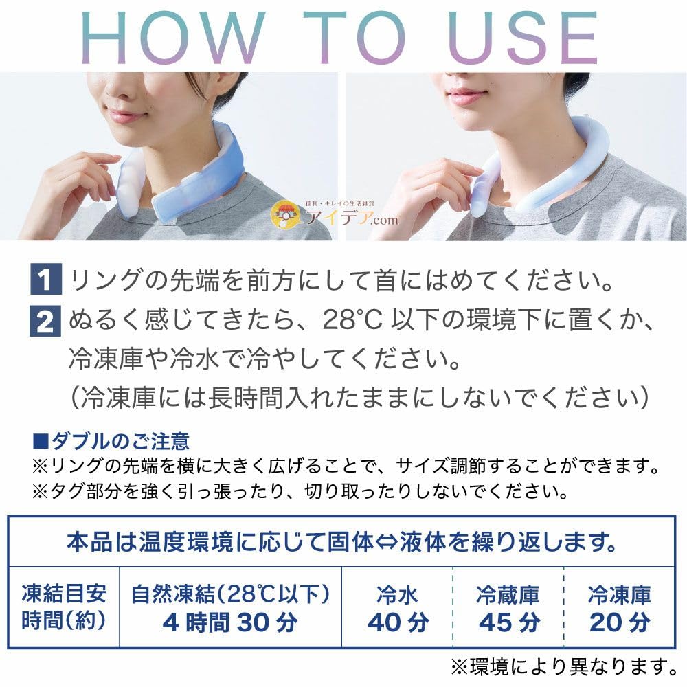 新登場!首の接触面積がワイドに!首全体を包み込んで、より冷たさを感じられるネックリング。冷凍庫に入れて更にひんやり5時間キープ。温度調節機能を持つ新時代の特殊素材「PCM」を使用。ブロック状のシートと樹脂プレートが首にしっかり密着するので、冷感アップ!アウトドア、リラックスタイム、家事、スポーツになどに。