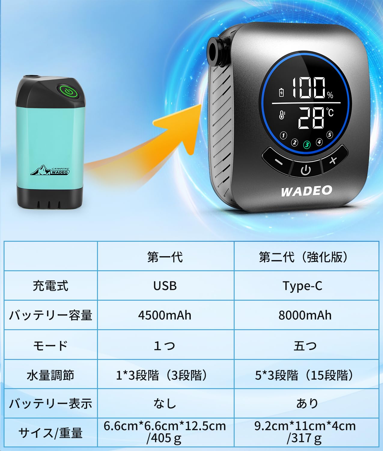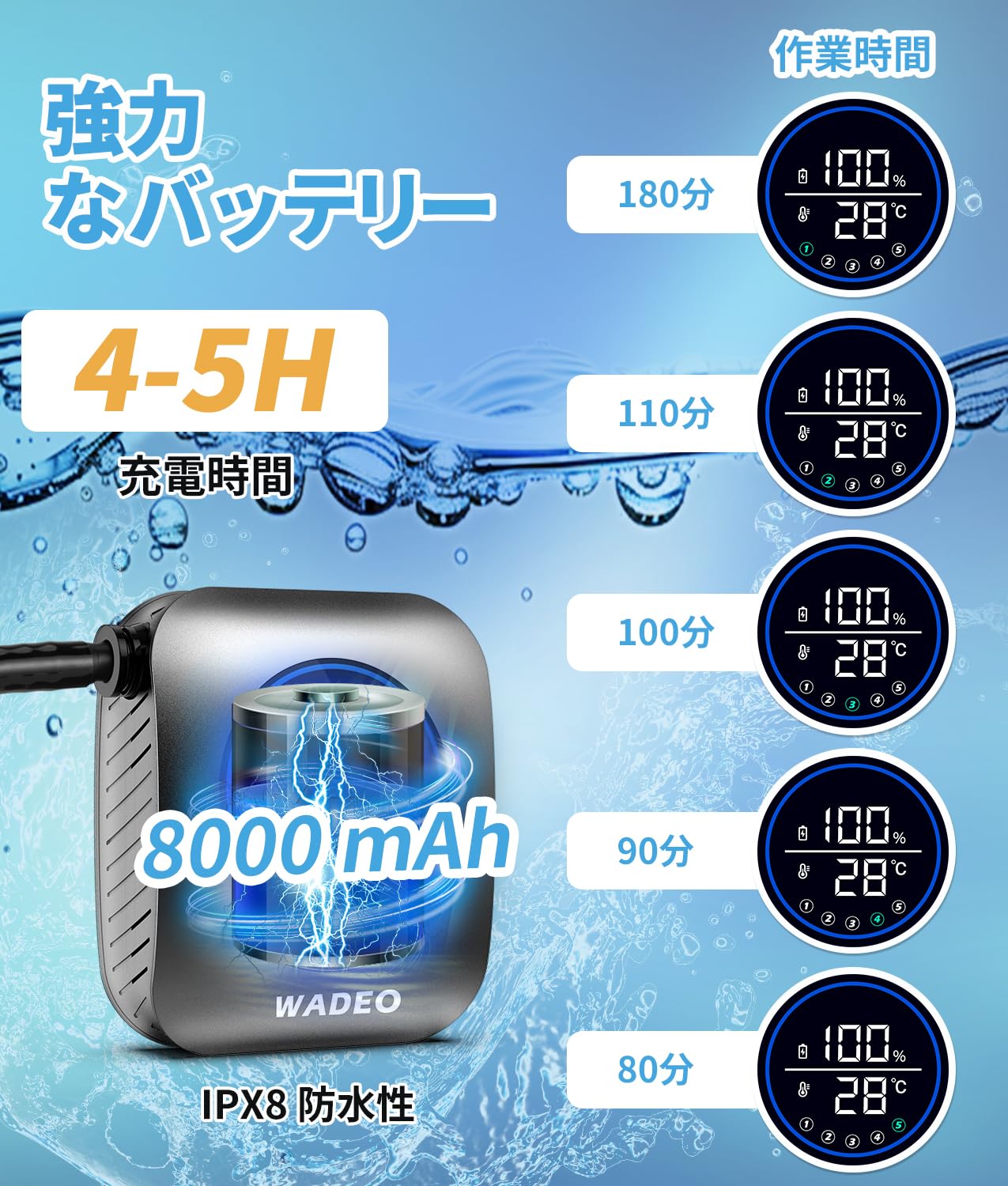 【USB充電式-8000mAh大容量】:ポータブルシャワー は8000mAh大容量バッテリーを内蔵しており、フル充電状態で最高180分間連続使用できます。一人はもちろん家族や友人と使う場合も使用可能時間が長いので安心です。