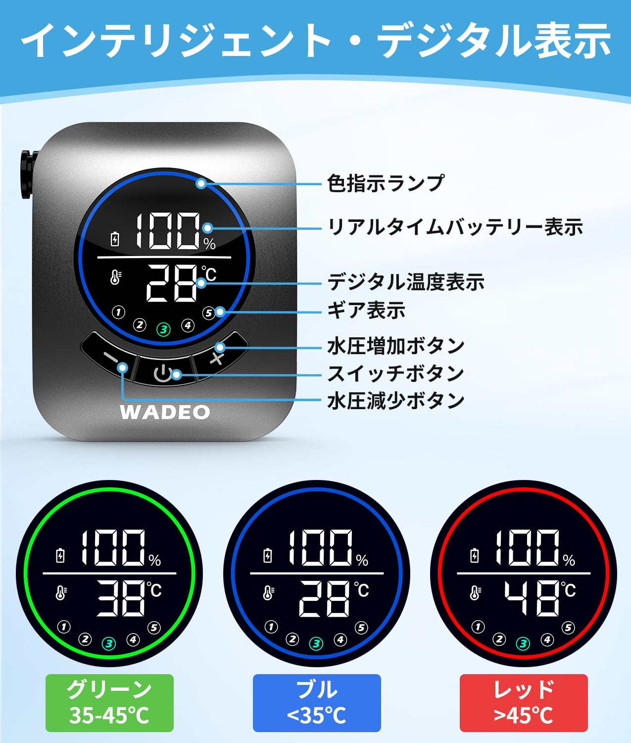 【手元止水&デジタル画面】:電動シャワーはストップボタンを押すだけで一時止水・出水を自由に切り替えます。また、携帯シャワーにディスプレイ付きで温度、出水モード、残量は液晶画面で一目で確認可能!(注意:加熱機能がなし)