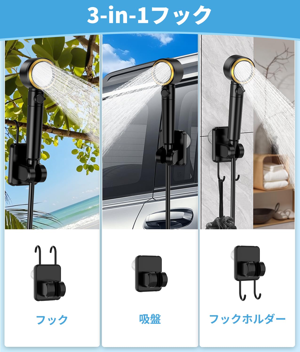 【5ギア圧力調整&四つ出水モード】: 全面グレードアップポータブルシャワー は1ギアモードから5ギアモードにアップして、より幅広く使えるようになって、水量調整は各ギアに3段階、計15段階調整可能です。また、ポータブルシャワーヘッドは実用的な4つの出水設定を搭載しており、様々なシーンでニーズに合わせてモードを切り替えることができます。