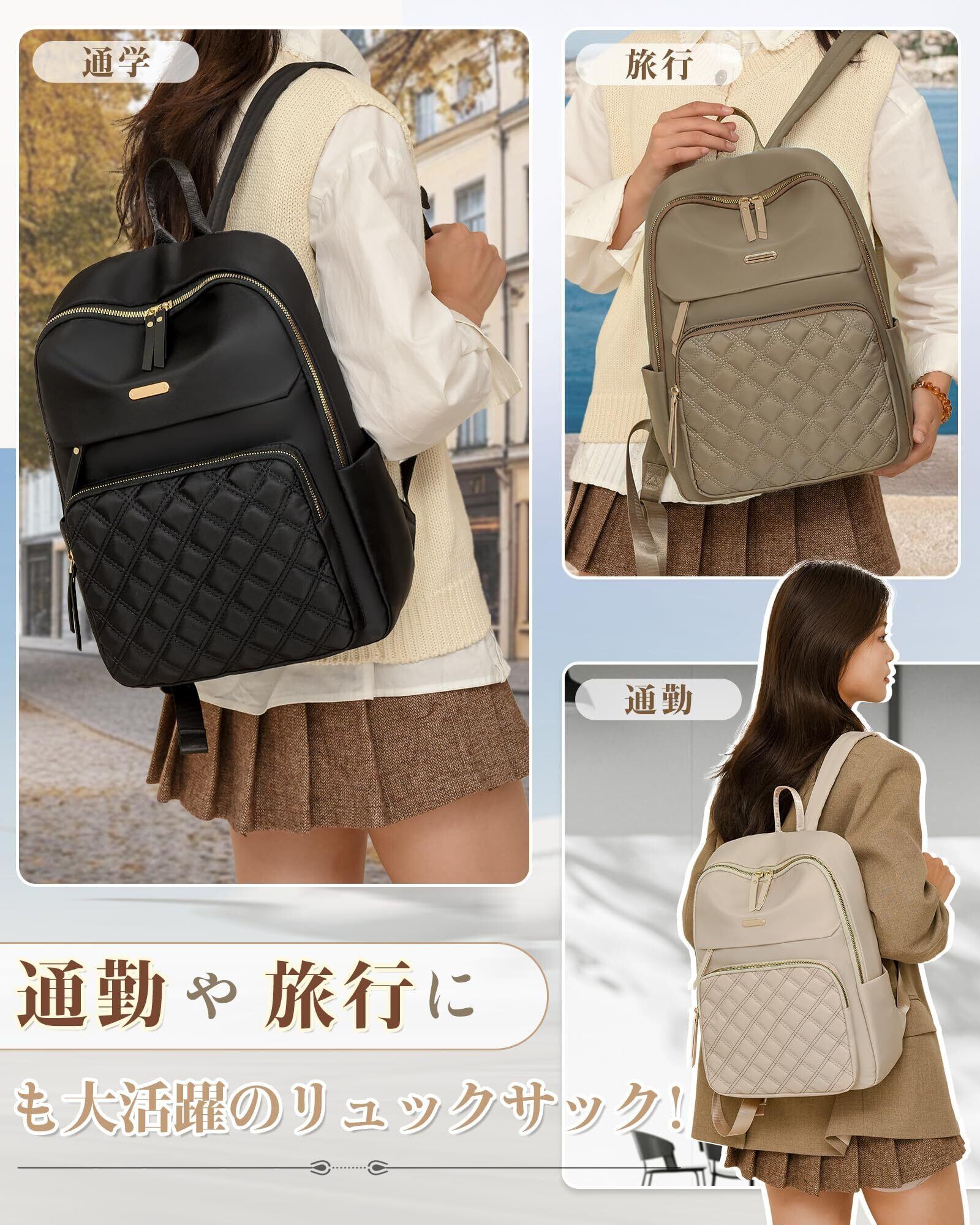 多収納ポケット:バックパックサイズ:幅24高さ33厚さ11cm、バックパックには複数のポケットデザインがあり、フロント部分には三つの小さなファスナーポケットがあり、口紅、バスカード、鍵など小物を収納できます。 大容量メインルームは11インチipad、雑誌、水筒、財布、ミニポーチなど内部に、小さなファスナーポケットと小さな口を入れることができます。 サイドポケット、小さな傘とコップが収納できます;後ろファスナー付きの小さなポケット、携帯電話、クレジットカード等の重要な物を入れることができます。 お出かけにはこれ1つで十分です。
