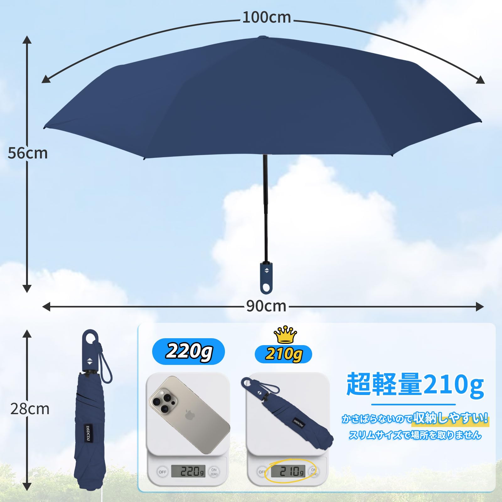 【超軽量&持ち運び便利】 コンパクトな大きさなのでバッグに隙間にも邪魔にならず入れることができます。折りたたんだ際の厚さはわずか4cm、長さは28cm、重さは約210gと 超軽量 折り畳み傘 です。他の日傘と比較して、収納スペースを約40%節約できる設計となっております。バッグや車に常備すれば、通勤や通学、旅行先でも手軽に紫外線対策ができ。