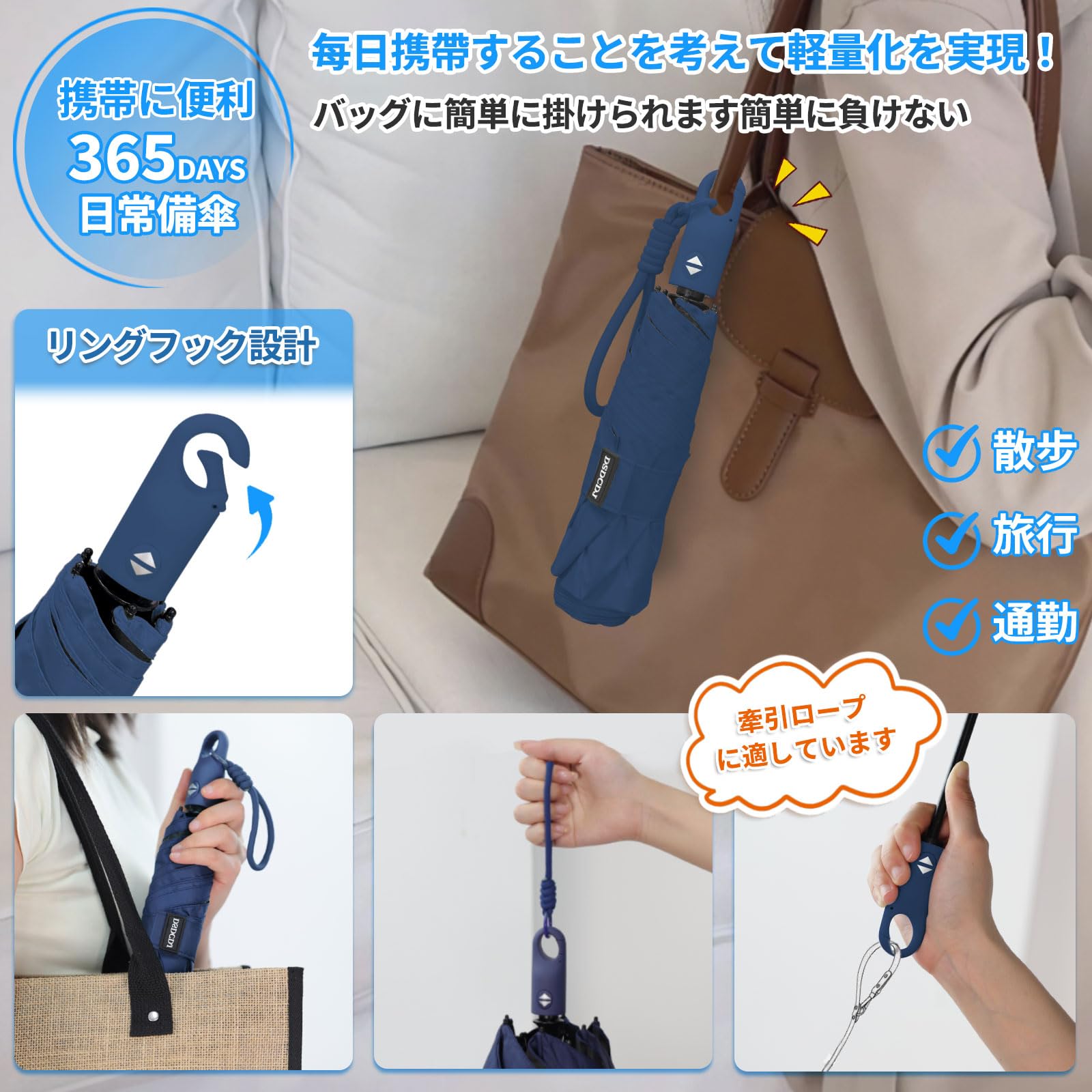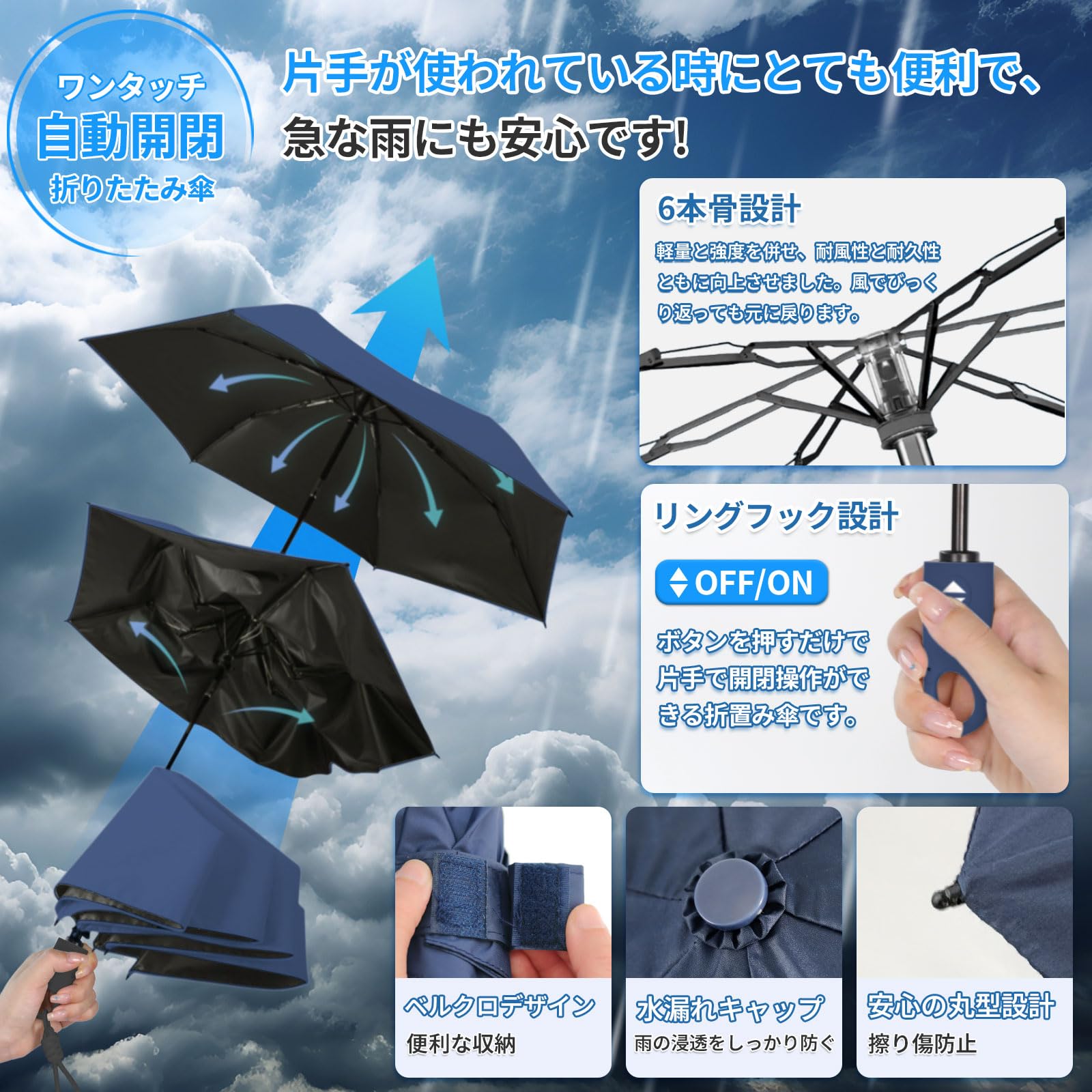 【ワンタッチ自動開閉傘&簡単に片手操作】ワンタッチ操作の自動開閉傘を採用しています。片手で簡単に操作できるため、荷物やスマートフォンを持っている場合でも簡単に傘を開閉できます。さまざまなシーンで使いやすさを実感できます。傘の開閉ボタンは厳格な品質テストを経ており、毎回の操作が正確で、優れた耐久性を備えています。