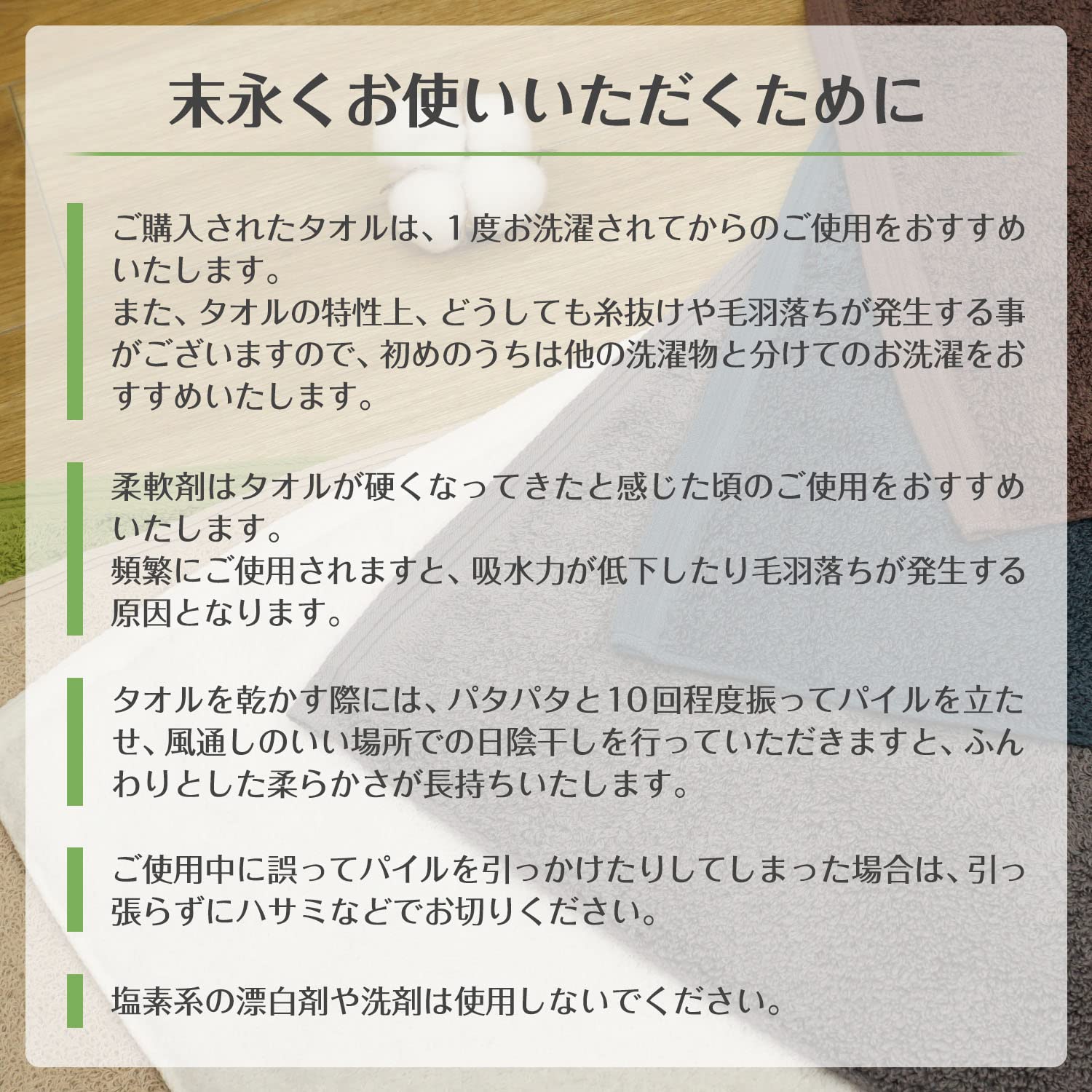 ■柔軟剤の過度な使用は毛羽落ちや吸水性の低下につながりますので、タオルが硬くなってきたと感じた頃のご使用をおすすめいたします。