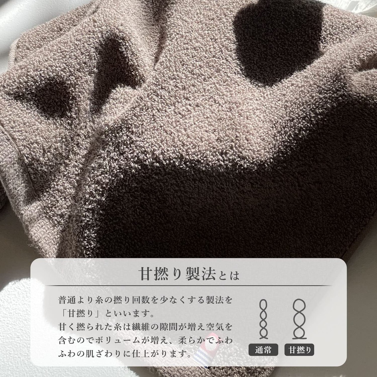 【甘撚り糸使用でやわらかな肌触り】 パイル(表面のわっか)部分に甘く撚った糸を使用している事が特徴です。 これによって薄手ながらもふんわりやわらかい肌触りを実現しています。