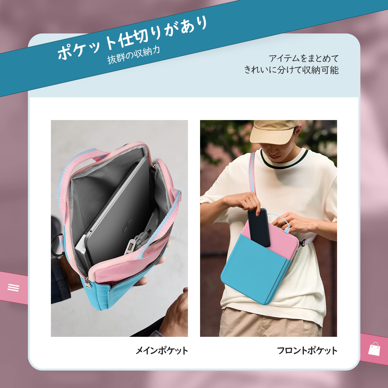 「ポケット仕切りが多い抜群の収納力」 ポケットや仕切りが多くに設計され、PCデバイス以外、周辺機器、ペン、イヤホン、ケーブル、充電器、携帯、名刺カード、財布やスマホなど、小さいなアイテムをまとめてきれいに分けて収納して持ち歩けます。外側にもマジックテープ仕様のポケットがついており、スペースが更に広くなり、抜群の収納力を実現してくれます。