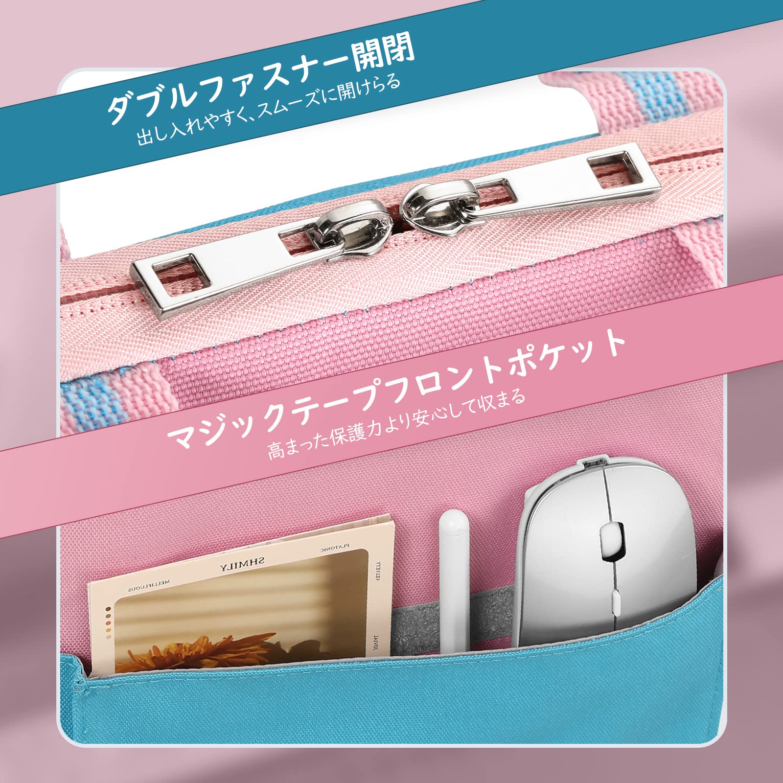 「出し入れやすく取り扱い簡単」 収納バッグ全体適度な厚みがありながら、体積を少なくして軽量化を実現した仕上がりになっており、メインポケットはデバイス収納の出し入れに便利でスムーズに開け閉めできるダブルファスナー仕様を採用し、防水性と安全性が高まり、スムーズに開けられるので、忙しいときにノートパソコンを素早く出し入れも対応できます。