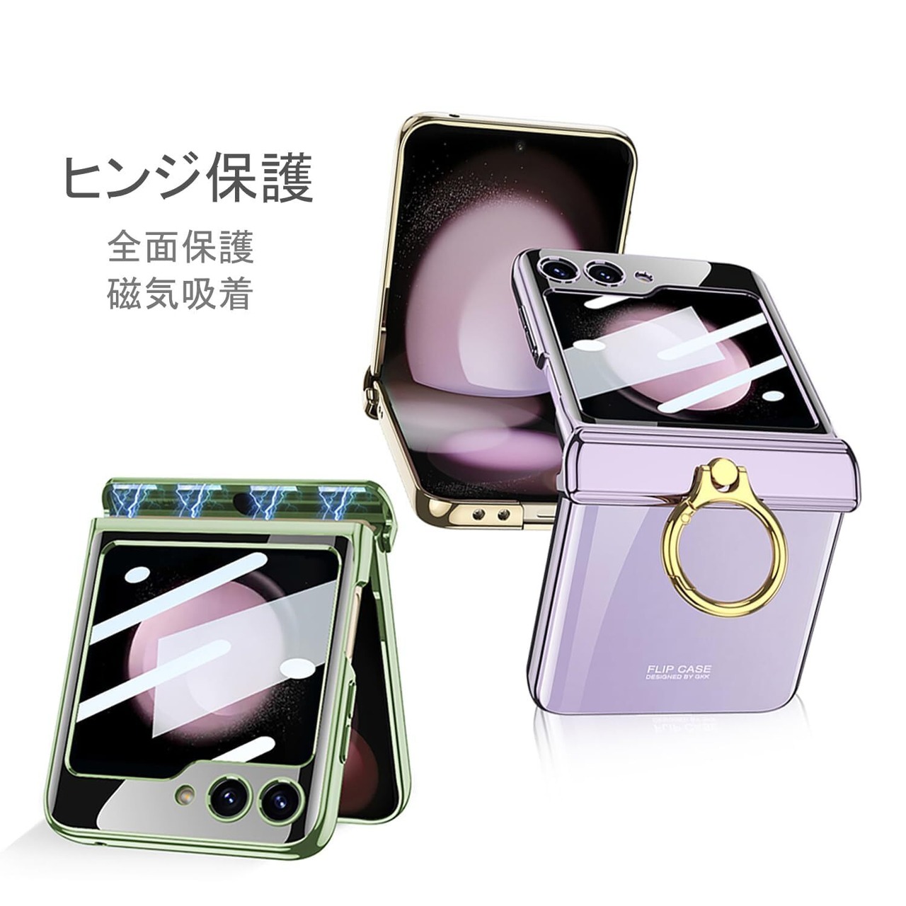 【在庫セール】Galaxy Z Flip5 クリア ケース ヒンジ保護 Samsung ギャラクシーZ フリップ5 用 カバー リング付き スタンド機能 Uovon スマホケース 背面に保護フィルム付き ストラップ穴付き メッキ 超軽量 超薄型 おしゃれ · グリーン