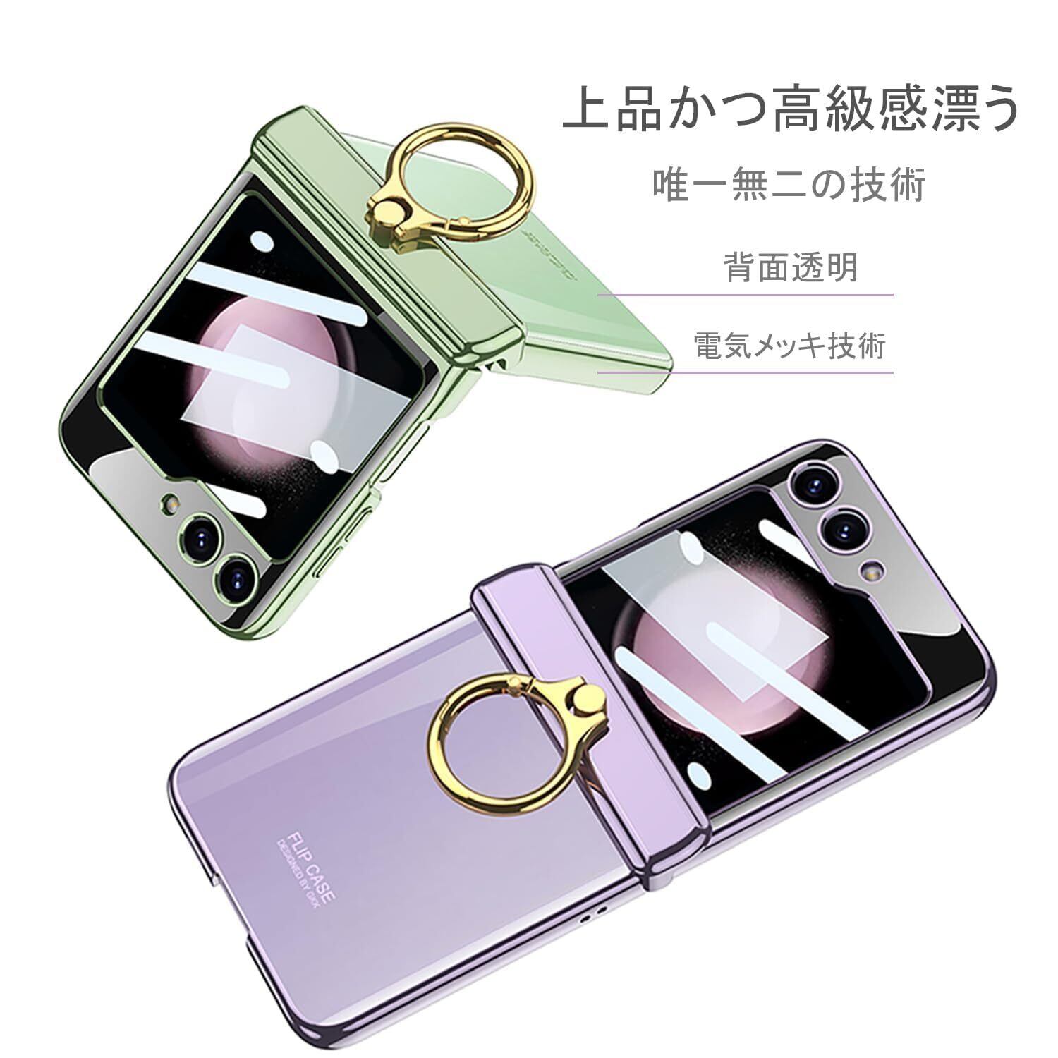 Galaxy Z Flip5 クリア ケース ヒンジ保護 Samsung ギャラクシーZ フリップ5 用 カバー リング付き スタンド機能 Uovon スマホケース 背面に保護フィルム付き ストラップ穴付き メッキ 超軽量 超薄型 おしゃれ · グリーン