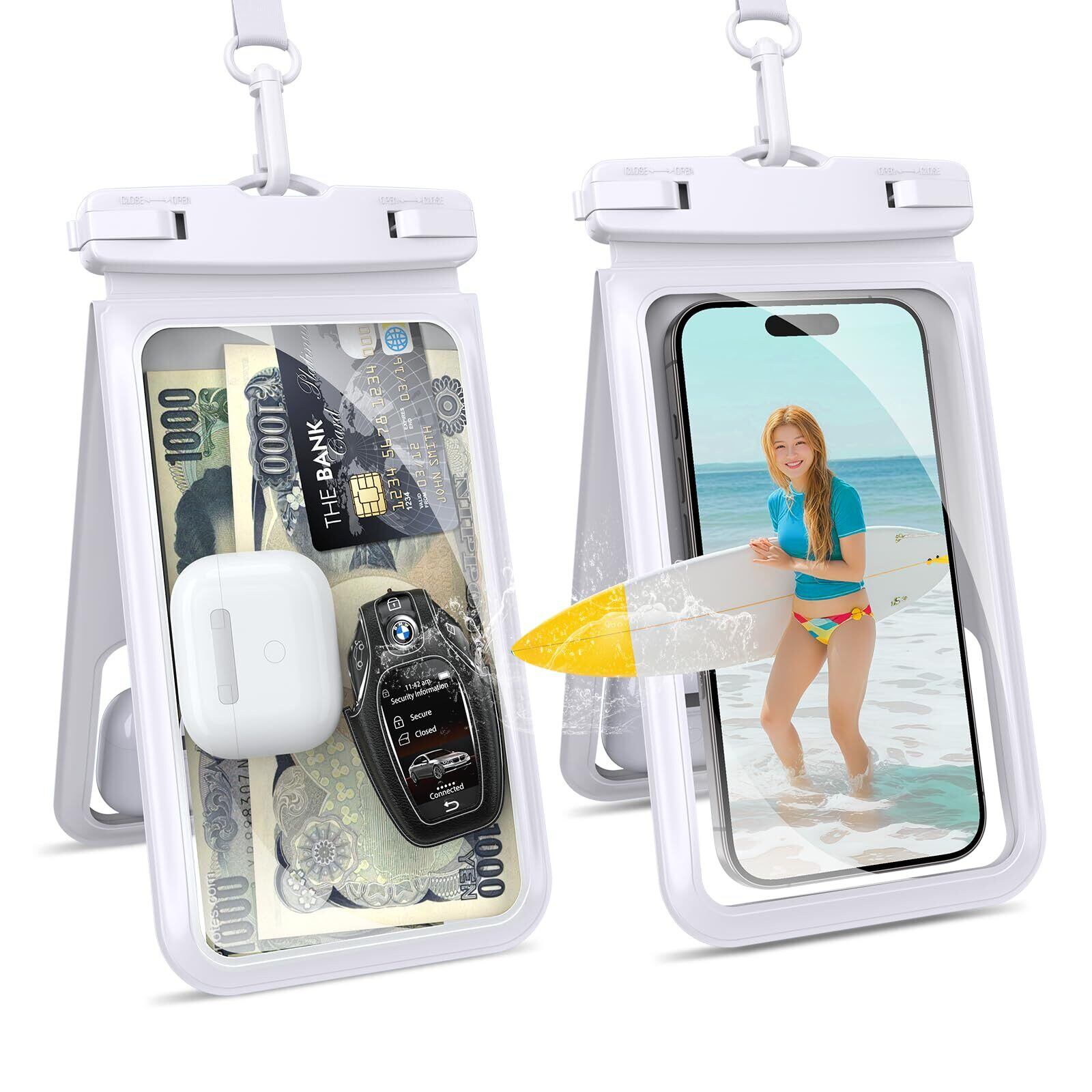 MINSLIS スマホ 防水 ケース【2枚セット・完全防水】IPX8 水中タッチ対応【2倍収納】小物収納 ダブルポケット お風呂/海/プール/温泉対応 高透過率画面 顔認証 両手解放 ストラップ付き iPhone/Android用 携帯ケース 雪遊び/スキー/登山/釣り用(ホワイト)