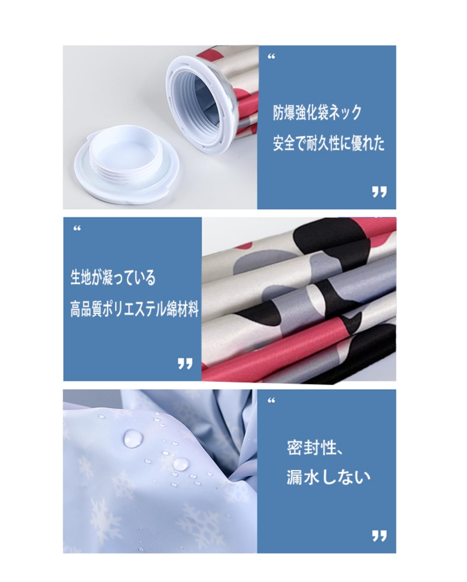 【最新の高技術採用】アイスバッグの裏に高品質なポリウレタンコーティング加工され、表に結露&水滴が生じにくく防湿で、シリコン製のリングを採用したキャップで水漏れもなくて、激しいスポーツでも水漏れの心配がありません、楽しく使えます。