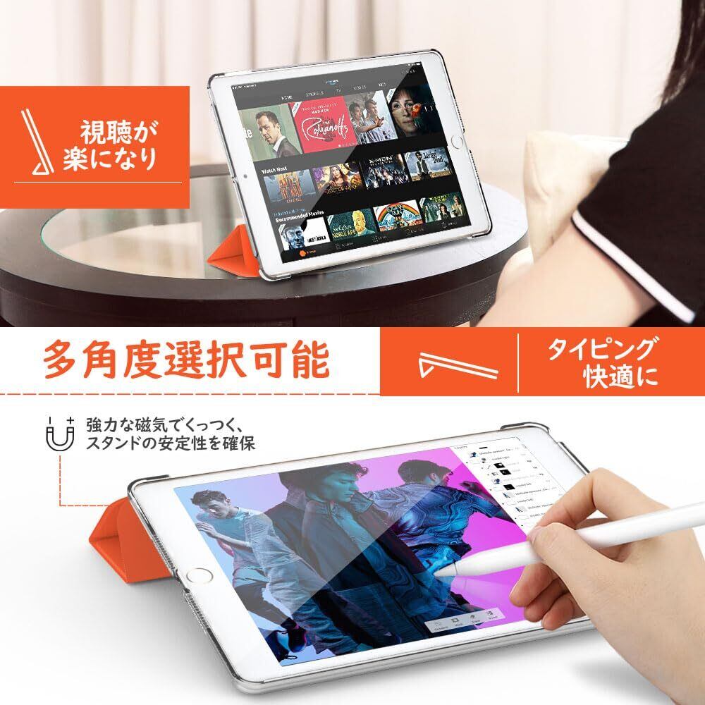 カバーを折れる仕様にデザインして、折巻きしてスタンドになれて、二つの置く角度調整できて、両手解放で動画観賞や、タイピング、ゲームなども快適にご利用頂けます。