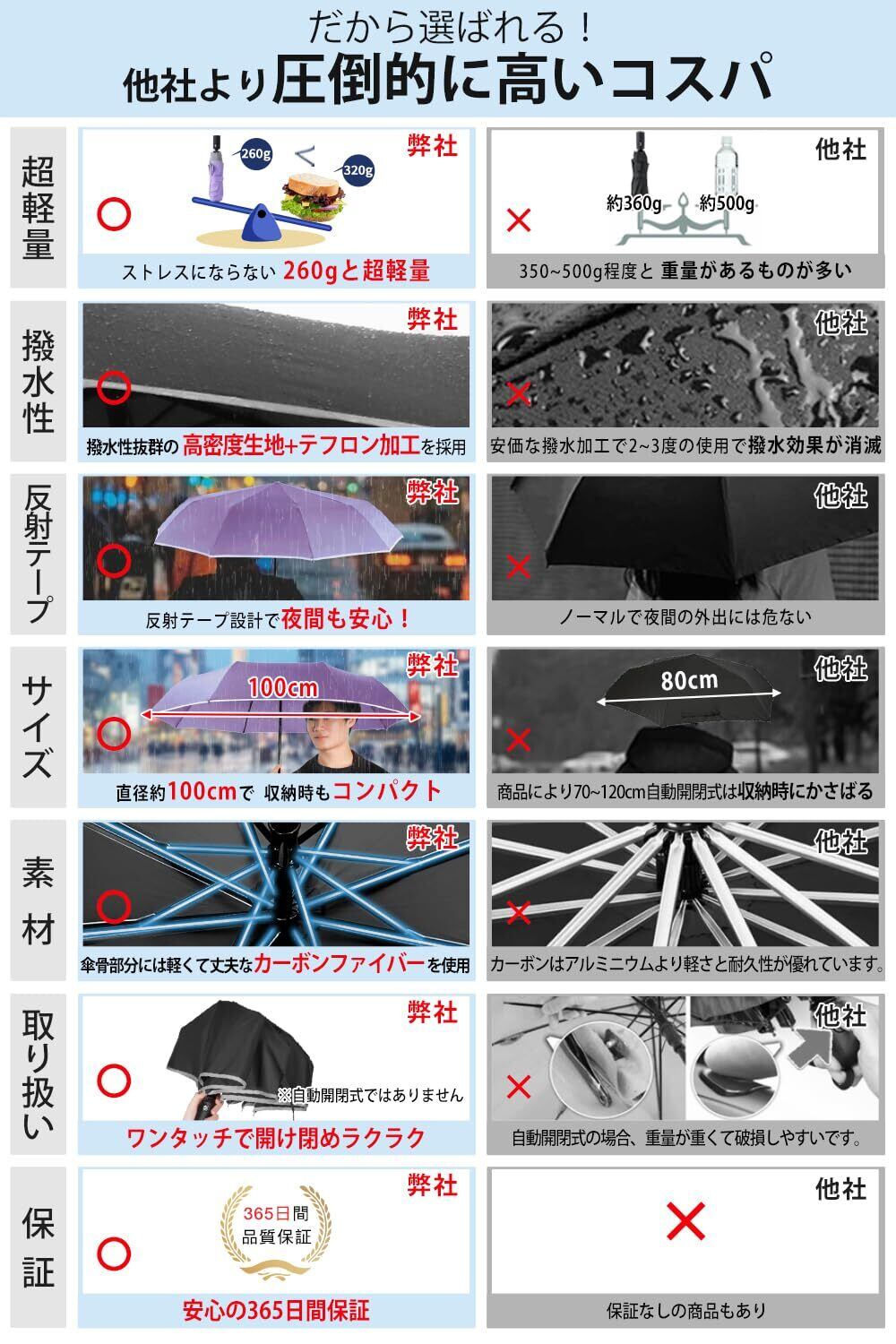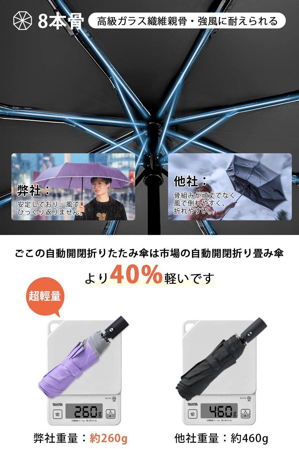 『強風や豪雨に負けない耐久性&高強度な傘骨』 頑丈で耐久性のあるグラスファイバー製傘骨を8本使用、腐食コーティング済で親骨が錆びにくくなっています。なお、軽量ながら頑丈であるアルミと壊れにくいグラスファイバーでできているので、軽くて普通の傘より横強度が20%強く、豪雨、強風にも安心できます。万が一風にあおられておりたたみ傘が裏返ってしまったとしても、開閉ボタンを押したら、元通りになるから、壊れにくいです。収納する時、頓挫感がありません。