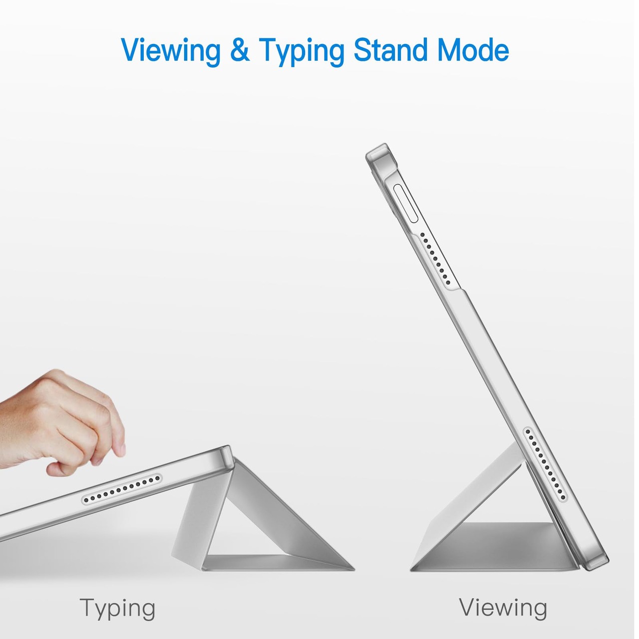 マグネット内蔵、オートスリープとオートウェイクアップ機能が付きます。三つ折りフロントカバーにより、視聴とタイピングに合わせた2つスタンド角度を調整できます
