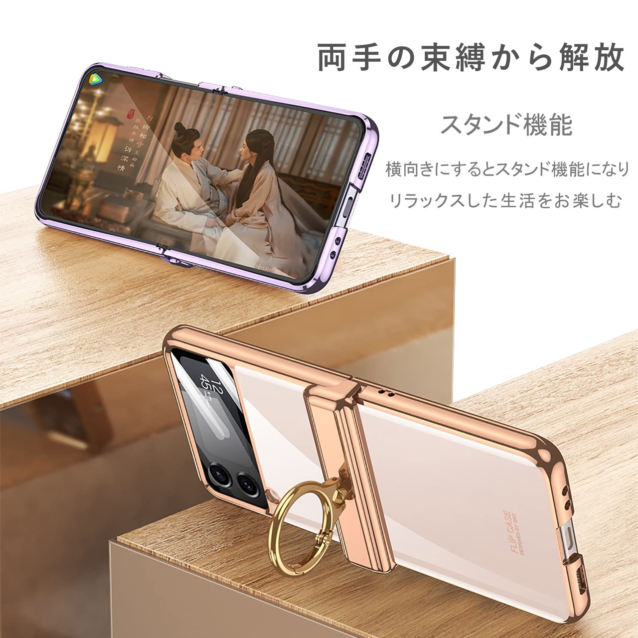Galaxy Z Flip4 クリア ケース ヒンジ保護 Samsung ギャラクシーZ フリップ 4 5G / docomo SC-54C / au SCG17 用 カバー リング付き スタンド機能 Uovon スマホケース 背面に保護フィルム付き ストラップ穴付き メッキ 超軽量 超薄型 おしゃれ · パープル