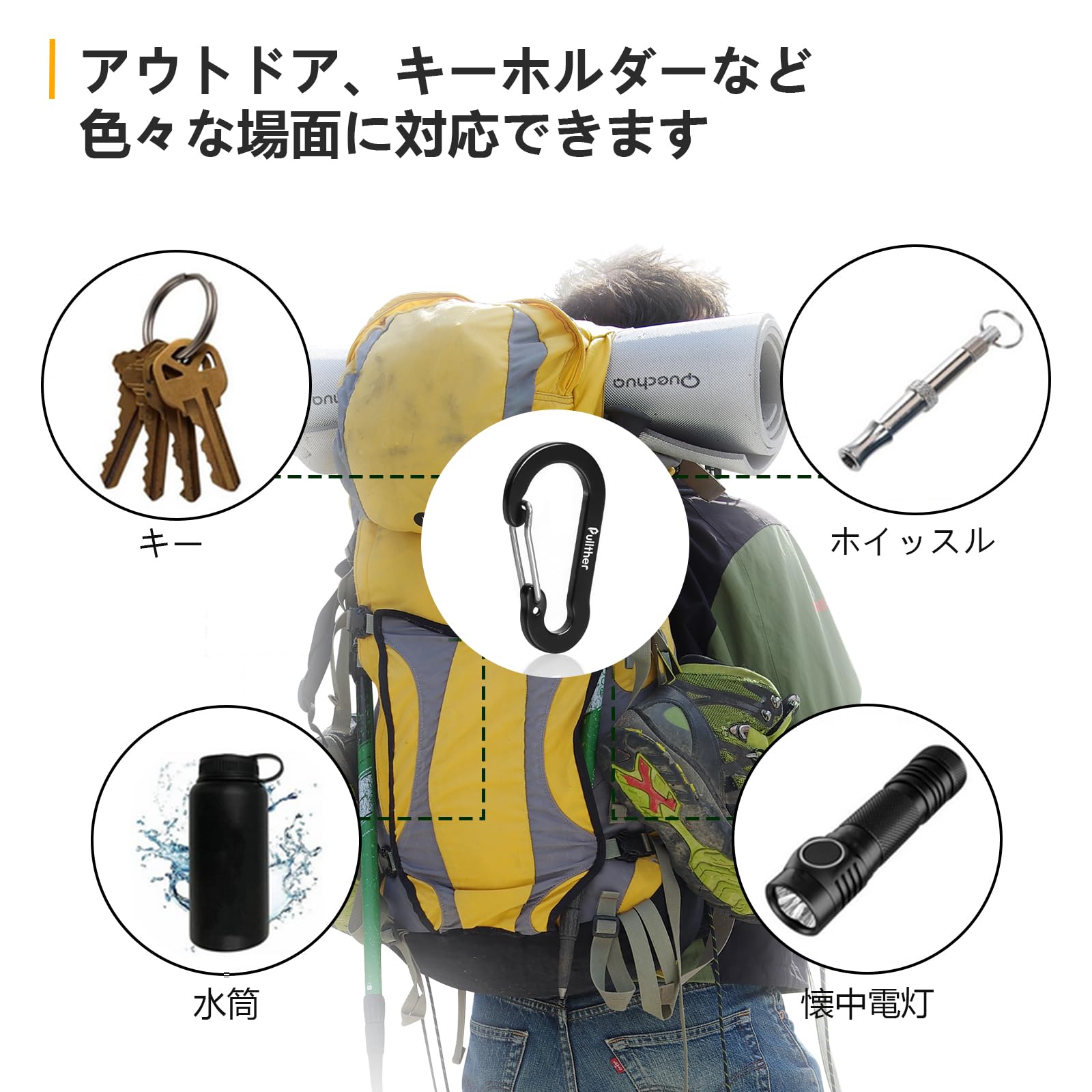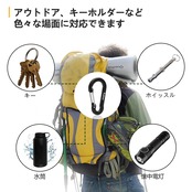このカラビナはリュックにBluetoothのスピーカー、テントの張り綱、鍵、キーホルダー、釣りの小物などをぶら下げるのに重宝しています。キャンプ、釣りで大活躍してます。