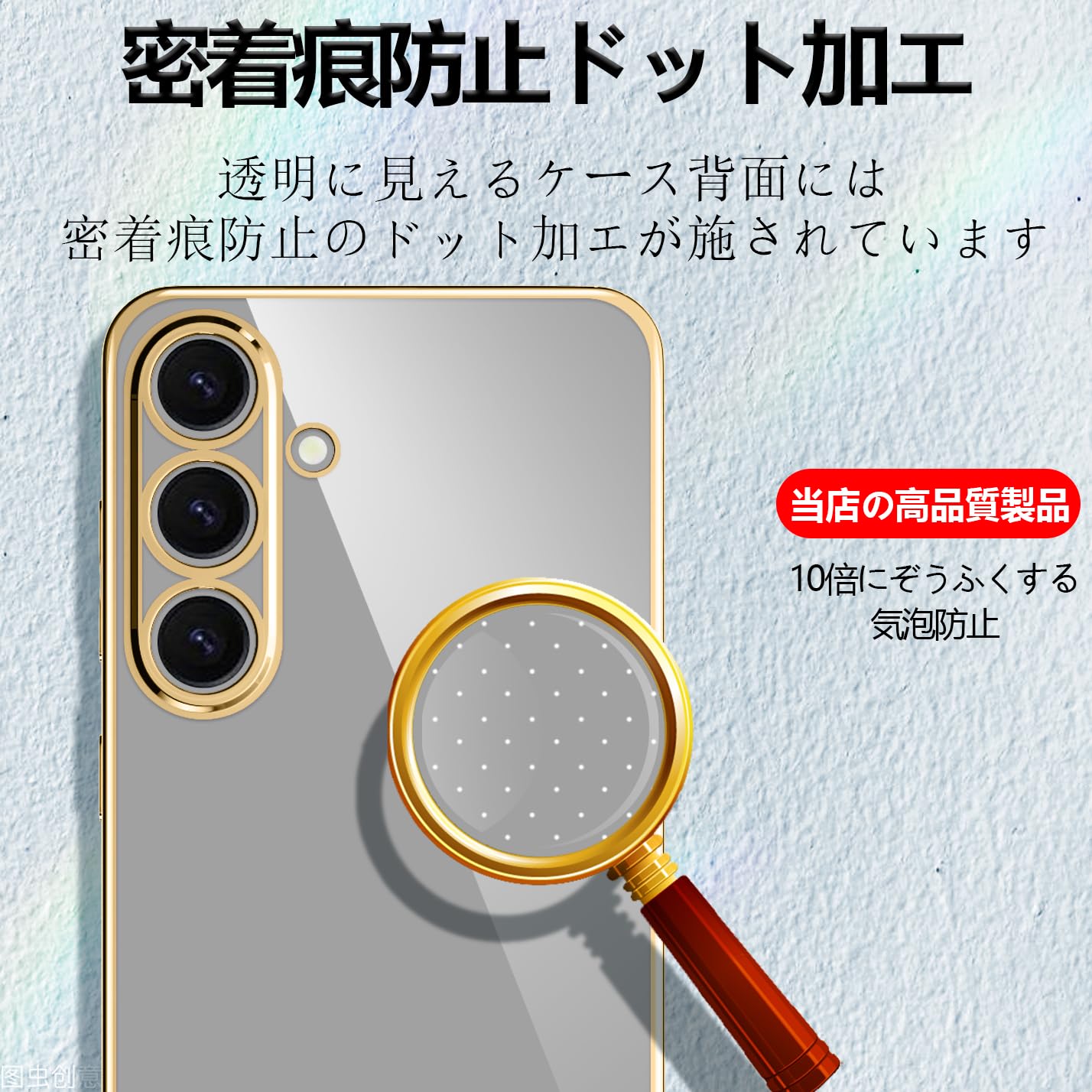 【背面マイクロドット加工】ケースには目に見えない粒子状の凹凸が施されており、気泡がケースの内側に発生したり、ケースが本体に接着してしまったりするのを防ぎます。ケースはいつでも取り外しが簡単です。