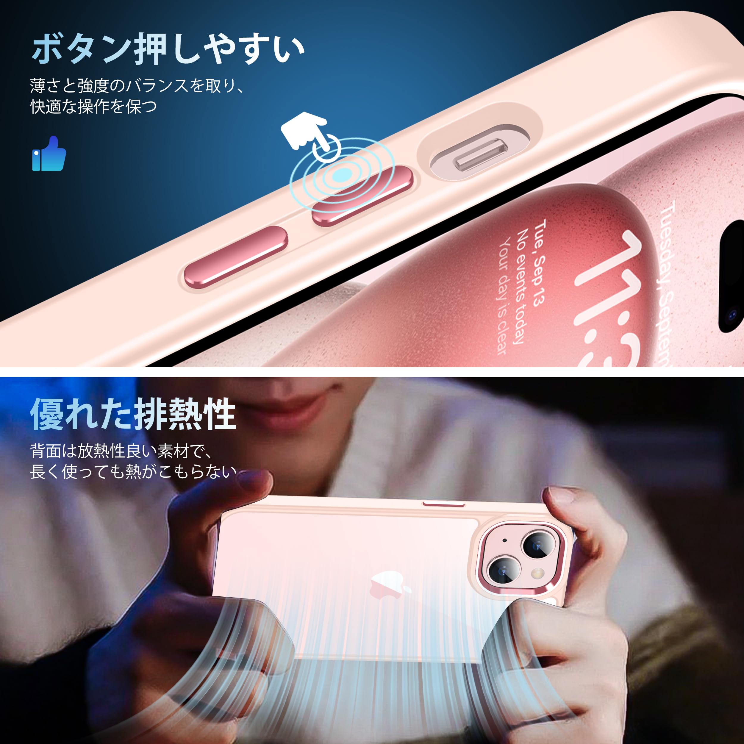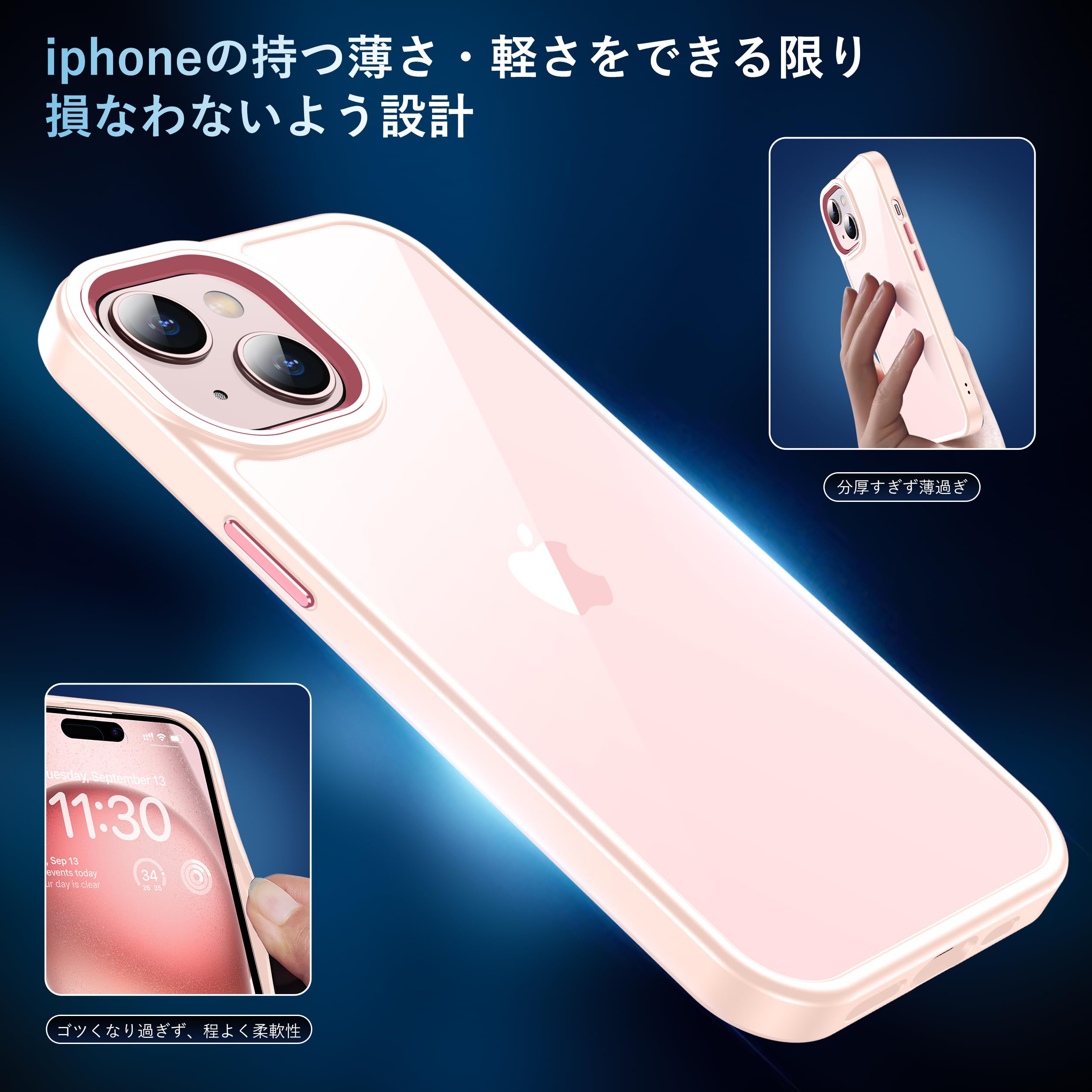 【高級感漂う・透明感抜群】 99.99%に持ち上げた透明感がiPhone15の美しさをそのまま。厳選した高透明度、更に耐黄変に強い特殊なポリカーボネート素材を採用、指紋がつきにくい・黄ばんでなく正真正銘のクリア!本来の崇高な美しさと高級感を損なわなく、いつものスマホに上品さをプラス。