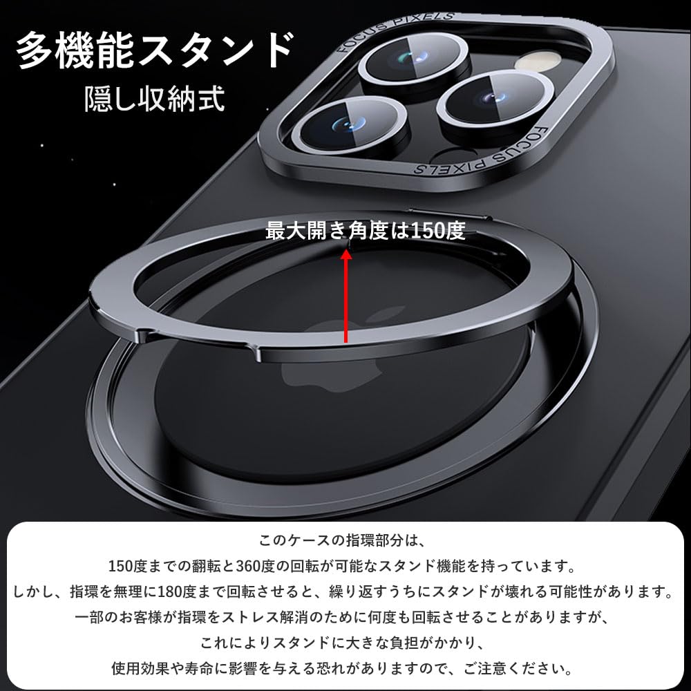 iPhone 15 適用 ケース Magsafe対応 アイフォン15 カバー 360°回転スタンド Uovon スマホケース アイホン15 携帯ケース ワイヤレス充電 車載ホルダー 対応 ストラップ穴付き 半透明 指紋防止 黄变防止 ・ ブラック