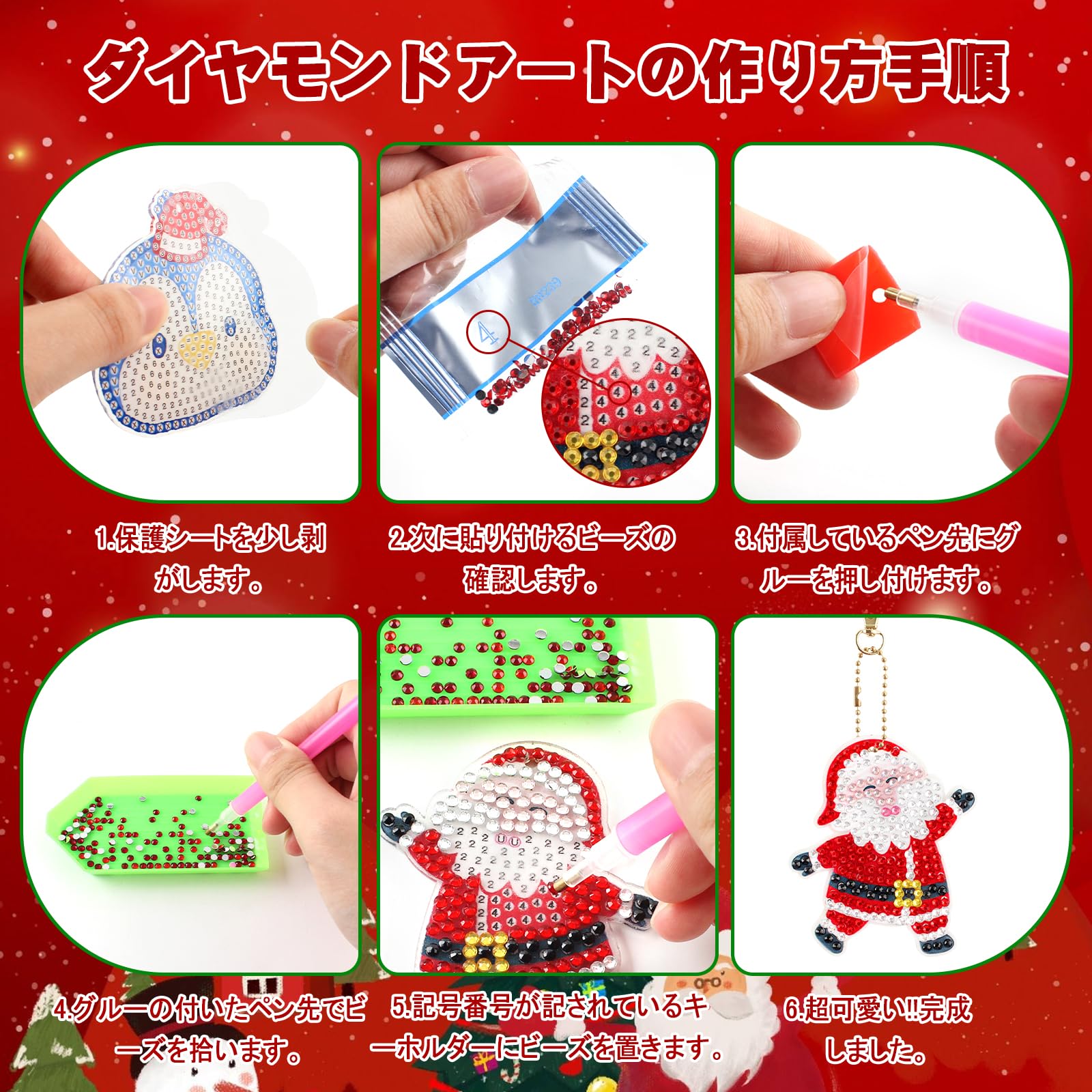 【ダイヤモンドアートキーホルダーパッケージ内容】 高品質樹脂 クリスマスセットx8、金属キーホルダーチェーンx8、カラフルなダイヤモンドx1、ビーズトレイx1、ダイヤモンドペンx1、接着剤x1。完成したダイヤモンドアートは財布・キーペンダント・バッグなどに装飾することができ、きれいな装飾品になります。自分で手作りのプレゼントは、家族や友人にとって非常に意味があります。