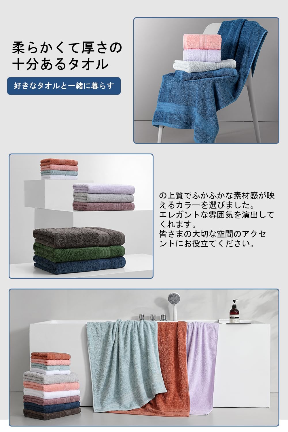【高い吸水性】:精梳綿のバスタオルは、優れた吸水性を持ち、水分を素早く吸収し、お風呂やシャワー後に快適なドライな肌触りを実現します。お風呂から上がったときに、しっかりと水分を吸収してくれます。また、水泳後や運動後など、汗をかいたときにも、速乾性が高いため、すぐに乾かすことができます。