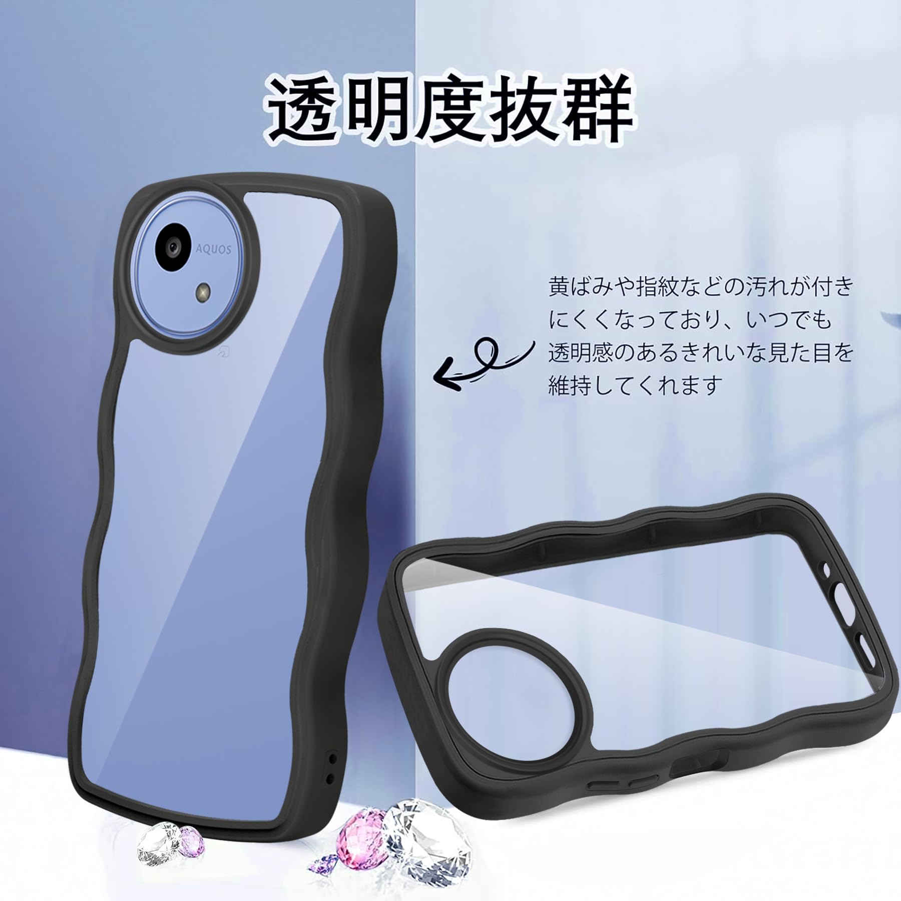 【人気商品】AQUOS wish5 SH-52F ケース クリア ウェーブ おしゃれ 韓国 かわいい 可愛い アクオス Wish5 スマホケース 人気 シンプル 滑り止め 薄型 軽量 耐衝撃 指紋防止 レンズ保護 ストラップホール付き シリコン 透明(ブラック)