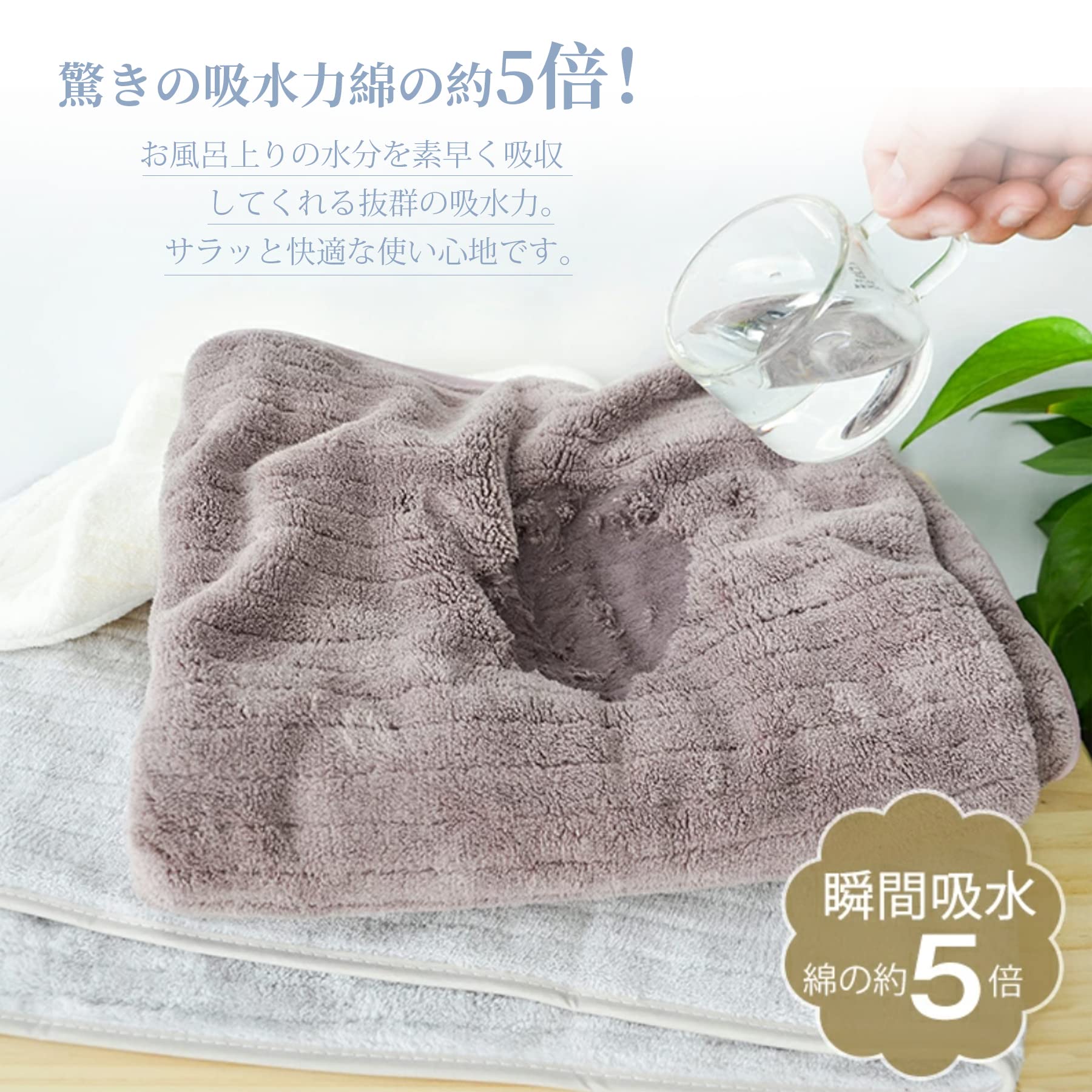 【優れた吸水性と速乾性】綿素材より優れた吸水性と速乾性。 マイクロファイバー素材の表面には無数の隙間があり、その隙間に大量の水を素早く吸収します。 髪や肌を軽く拭くだけで水分を吸収し、ホコリがつきにくいです。 バスタオルの隙間により、隙間に溜まった水分を空気が素早く拡散させるので、乾燥が早く、無菌で衛生的な状態を保つことができます。 梅雨や湿気の多い季節でも清潔を保ちます。 乾きにくい洗濯物にも快適にお使いいただけます。 室内干しも可能です。