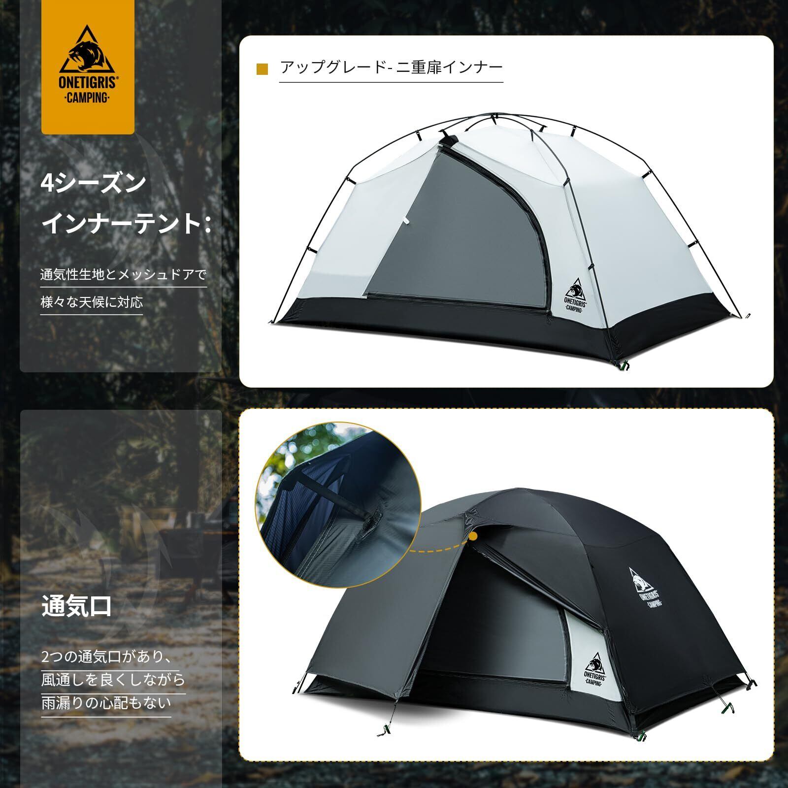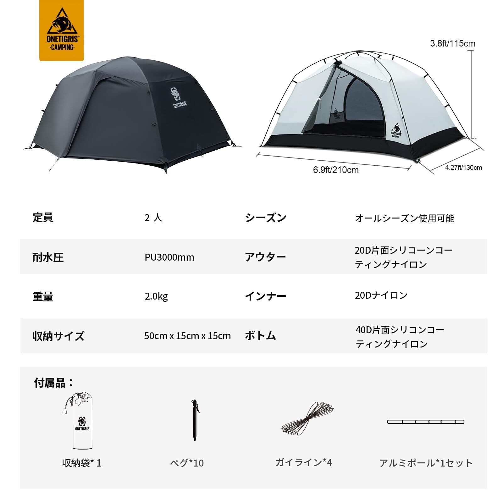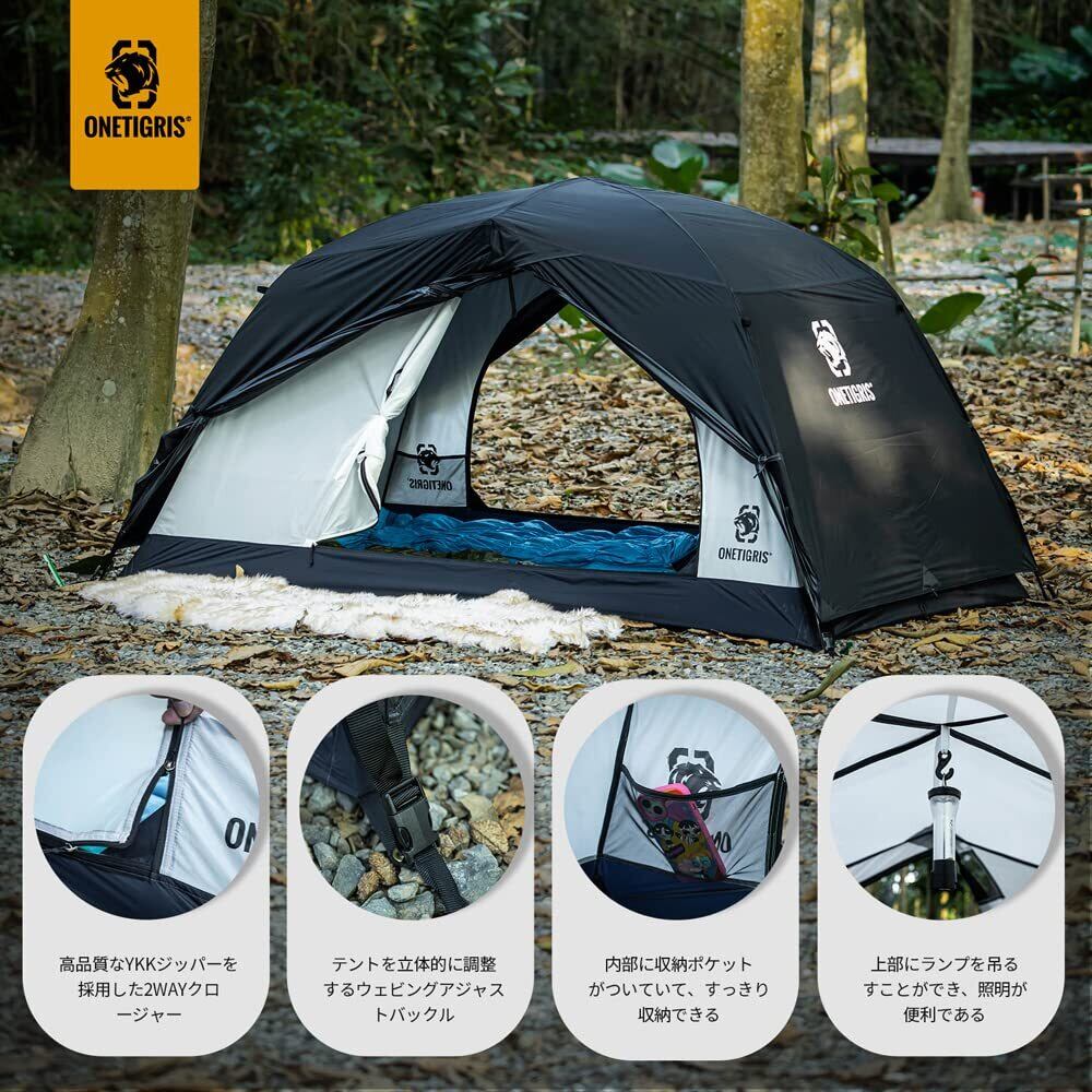 OneTigris STELLAテント 2人用 ドームテント 4シーズン 二重層 前室付き 耐水圧3000㎜ 自立式 山岳 キャンプ 用品 登山 キャンピング 収納袋付き