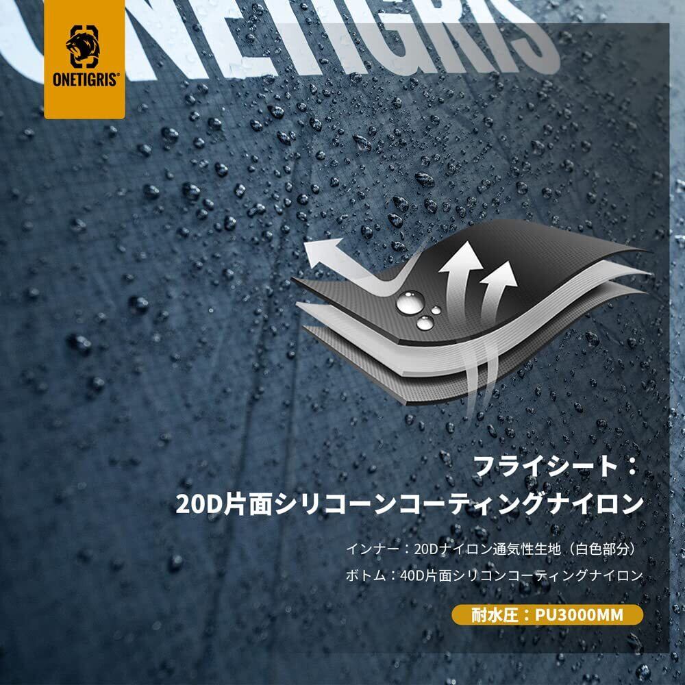 【高品質素材】当社のテントは、軽量で高い防水性能を実現するために、20Dナイロンシリコンシングルコート生地を使用して、生地は軽く柔軟で耐久性に優れています。 また、底布には厚手の40Dポリエステル生地を使用しており、高い防水性能を実現しています。ファスナーには日本の有名ブランドYKKを採用しており、耐久性に優れています。テントポールには7001アルミニウムポールが採用されて錆びにくくなっています。