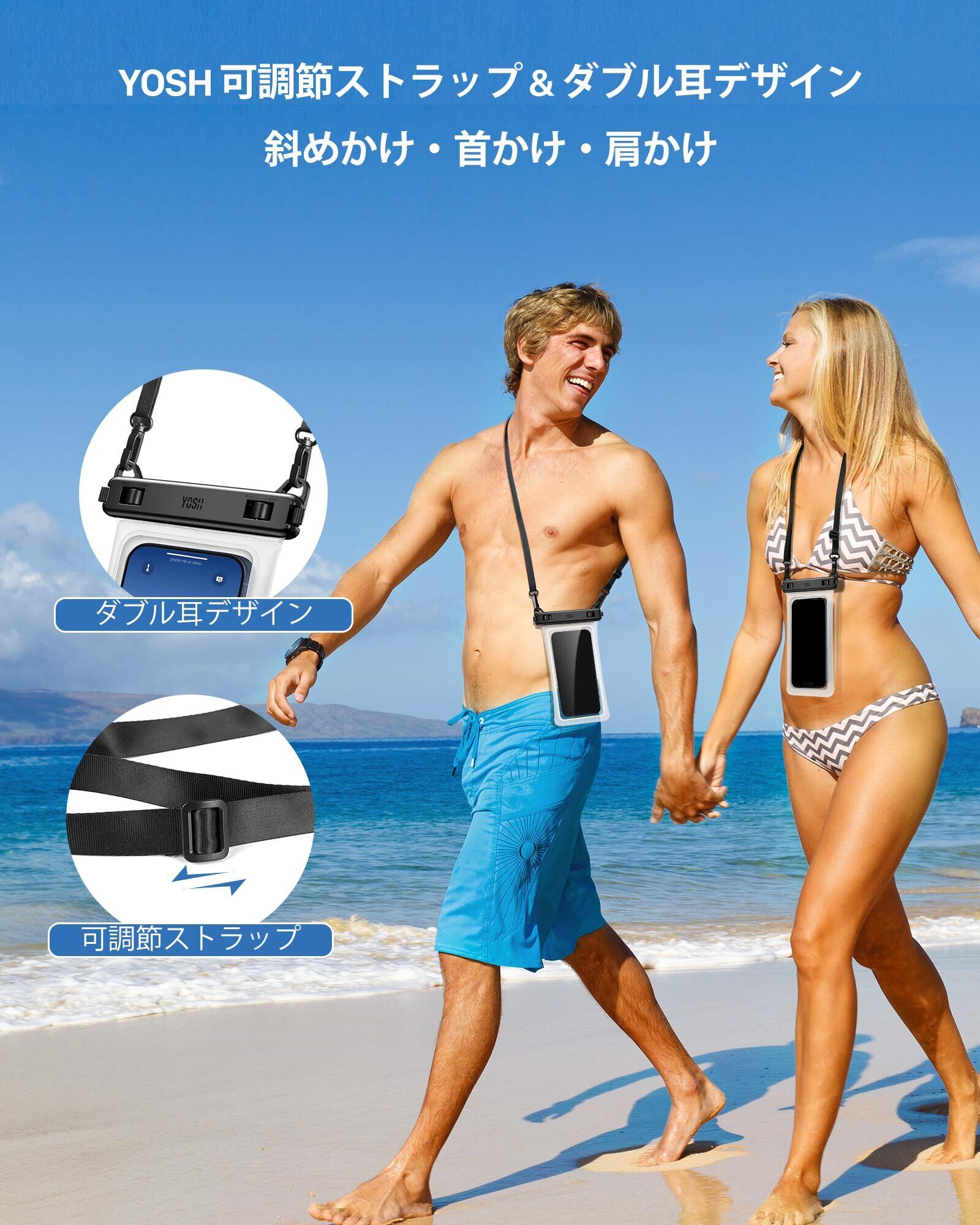 YOSH 2枚セット スマホ防水ケース 【ソフトなTPU材質・タッチ操作性改良】斜めかけ ダブルフック IPX8 防水スマホケース ネックストラップ調節可能 7.5インチ対応 シュノーケリング スイミング 海 プール 釣り 雨 潜水 水泳 雪 お風呂 温泉適用 iPhone/AQUOS/ARROWS/Pixel/Xperia/Galaxyに対応 透明TPU