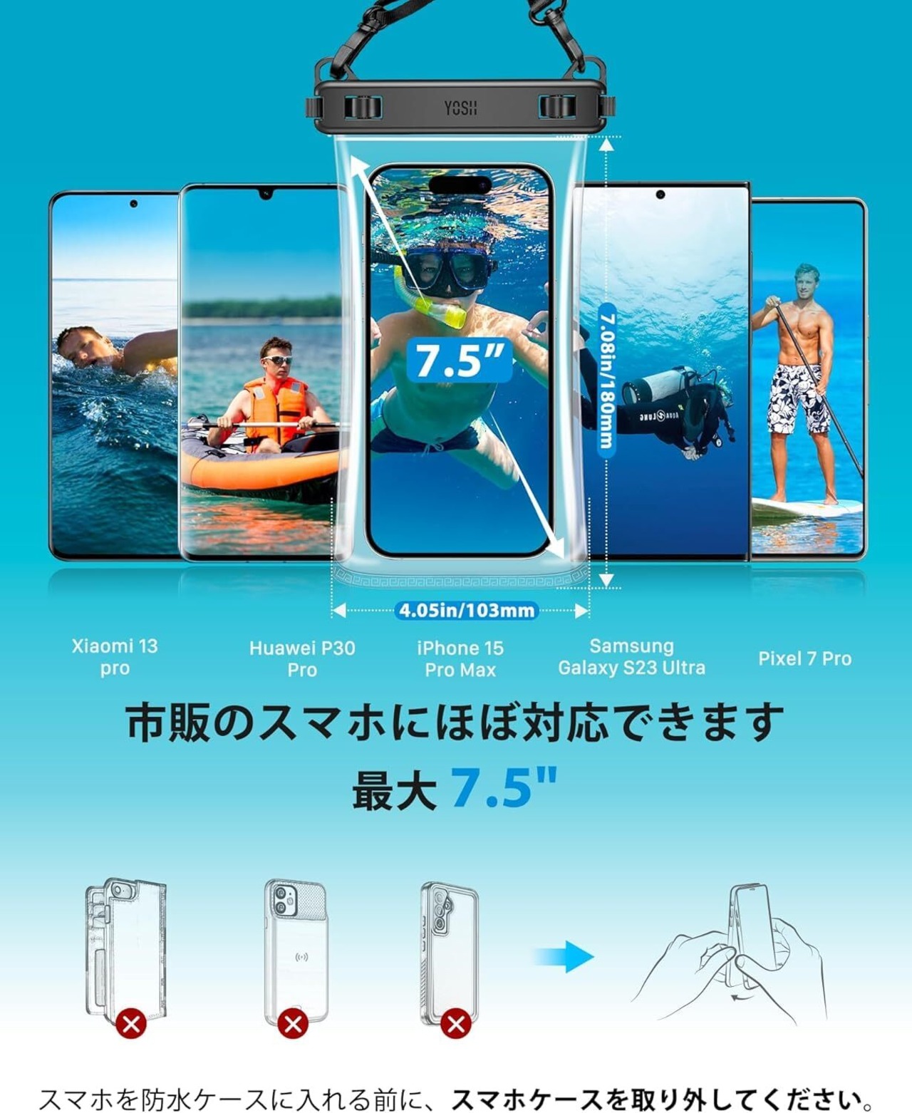 7.5インチ対応&多機能:YOSH新型TPU防水ケースは、最大7.5インチのスマホに対応します。iPhone/Galaxy/Xperia/Aquos/ZenFone/HUAWEI/Android等(スクリーンサイズ7.5インチ以下)のスマホに全数対応できます。撮影、タッチ操作、通話も可能で、さまざまなアウトドアシーンで活躍します。スマホの他、パスポート、カード、現金なども収納できます。