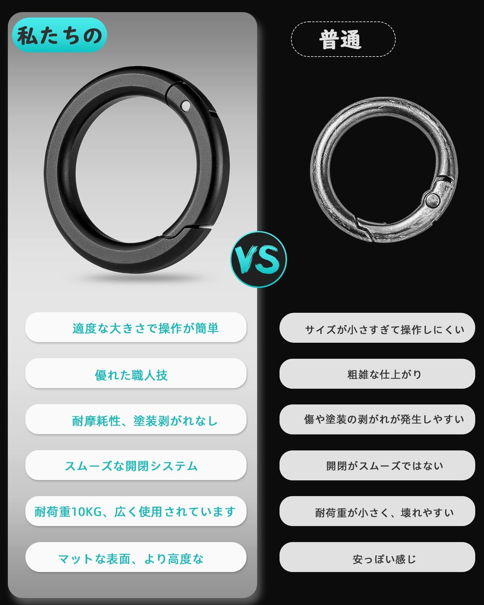 [便利でシンプルなキーリング]バネ式の開閉で簡単に使える、あると便利な丸型カラビナフックです!通常のキーリングとは違い、フック部分がスプリング式なので、片手でも脱着が簡単にできます。上質なスプリングを採用しており、開けやすいのに閉じる力もしっかりです。素早い操作で、わずらわしい作業を解消させる役割もあります。アイテムを吊るす時に強めのバネでしっかり閉じてくれます。工夫次第でいろいろ使用可能な便利なカラビナリングです。